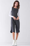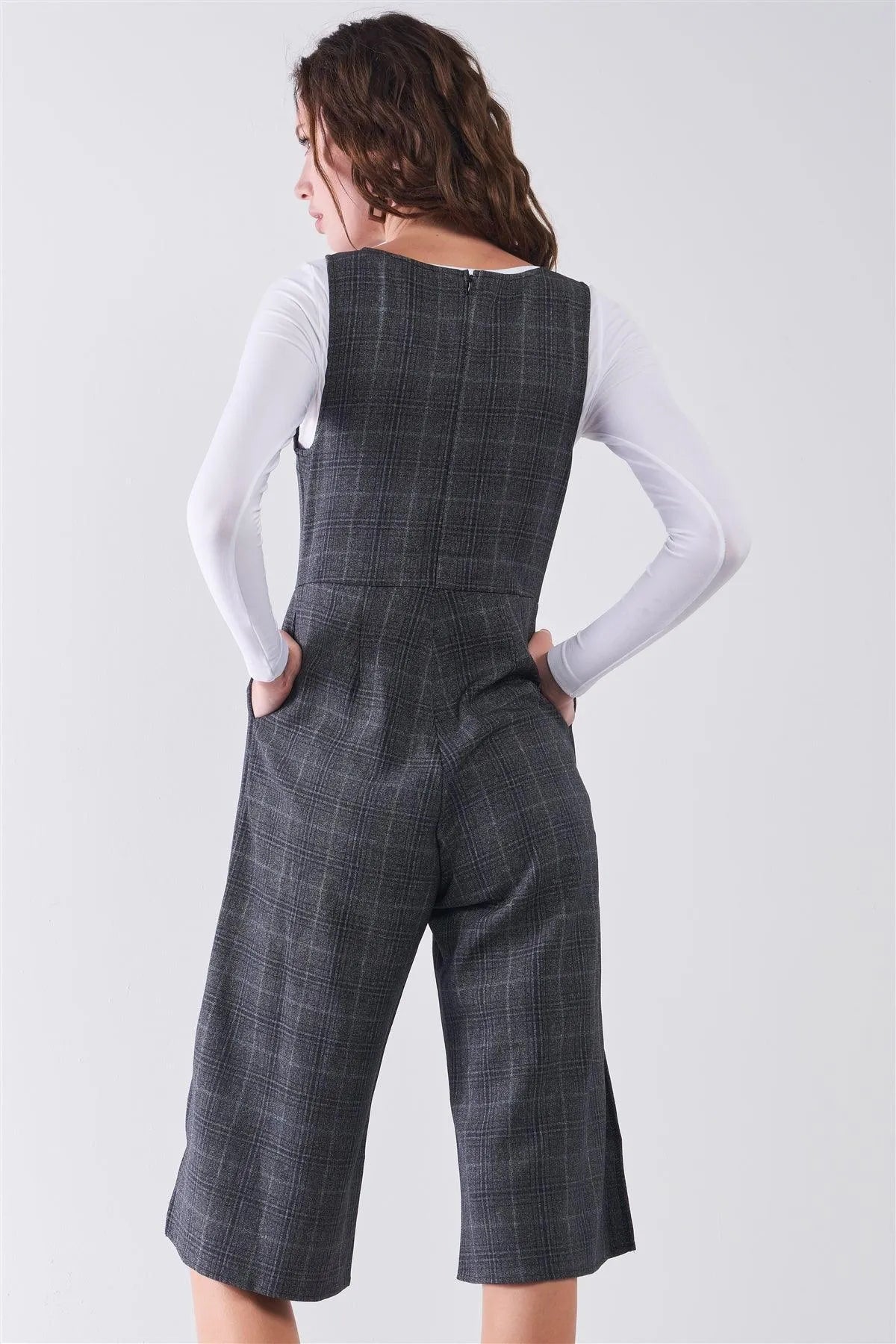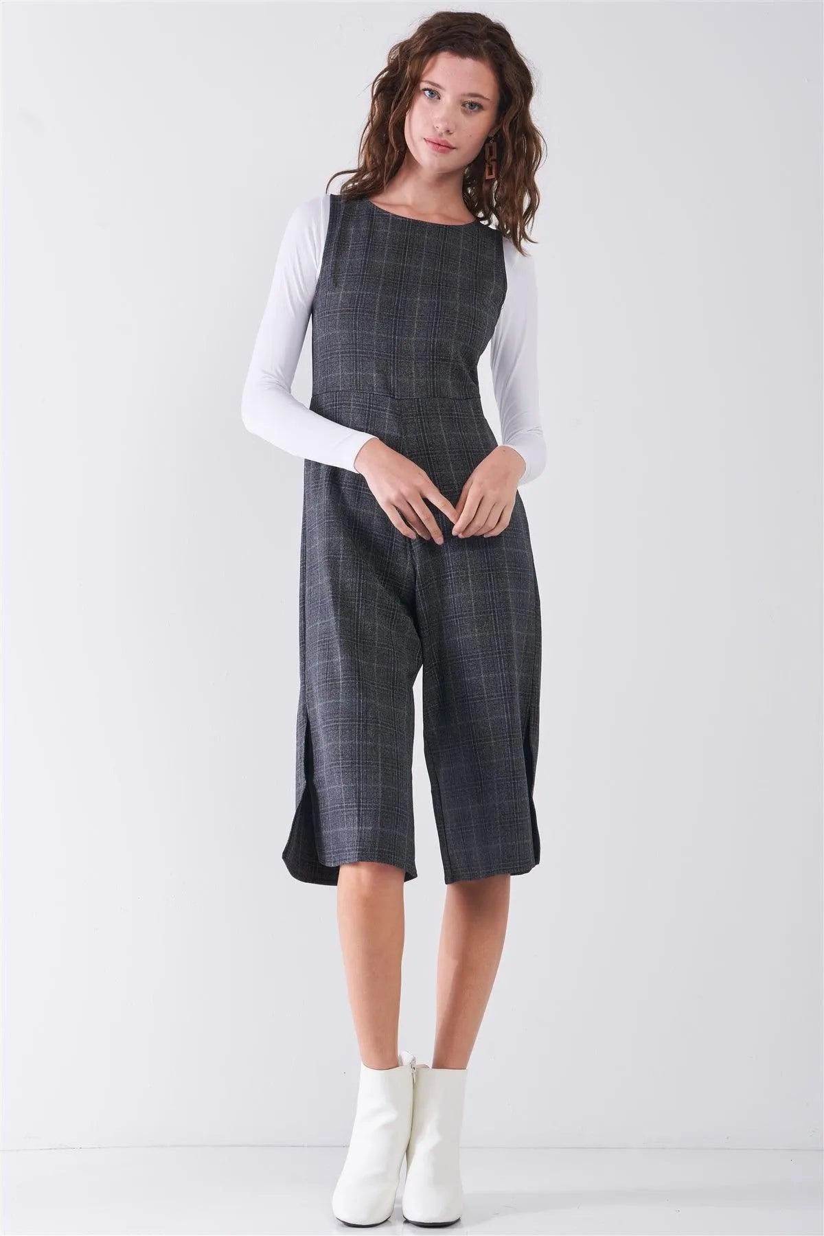 Dark Grey Preppy Sleeveless Glen Check Print Round Neck Slit Detail Wide Leg Midi Jumpsuit /2-2-3