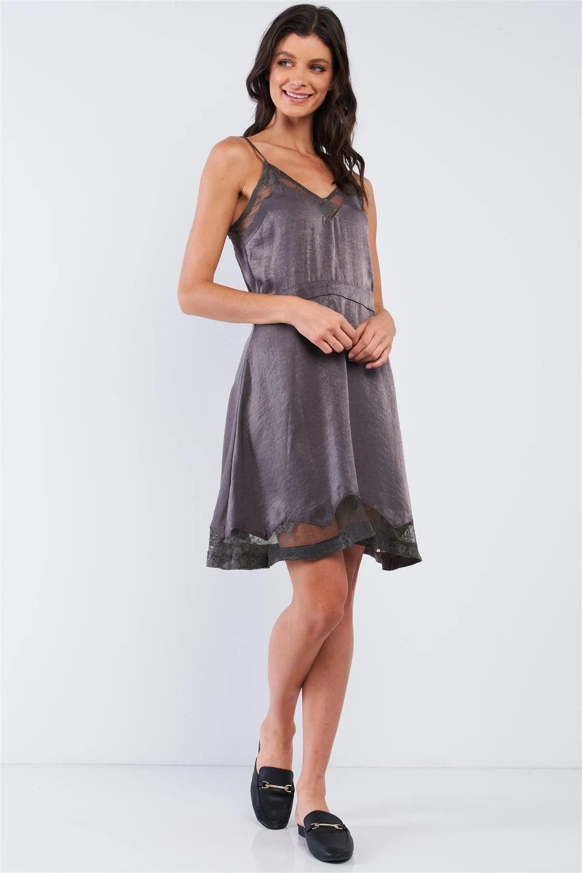 🖤 Item features: Dark grey, satin, regular fit, embroidered mesh hem v-neckline, embroidered mesh bottom hem, sleeveless, adjustable straps, mini length, invisible back zipper fly closure and two elastic loop button closures, soft to touch, silky, casual chic, party wear, night out, date night dress, spring/summer wear