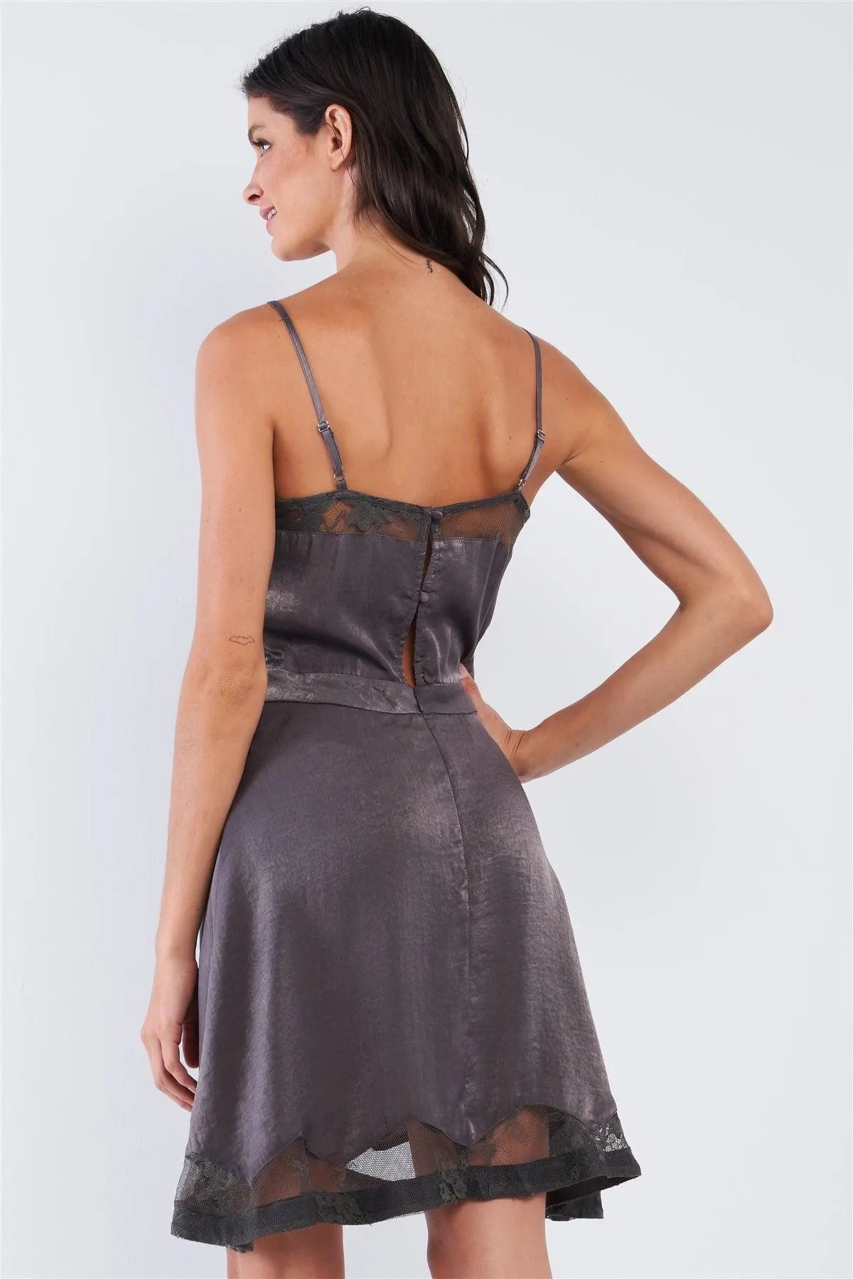 🖤 Item features: Dark grey, satin, regular fit, embroidered mesh hem v-neckline, embroidered mesh bottom hem, sleeveless, adjustable straps, mini length, invisible back zipper fly closure and two elastic loop button closures, soft to touch, silky, casual chic, party wear, night out, date night dress, spring/summer wear