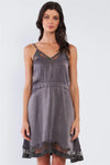 Dark Grey Chic Satin Sleeveless Embroidered Mesh Hem V-Neck Mini Dress /1-2-2-1