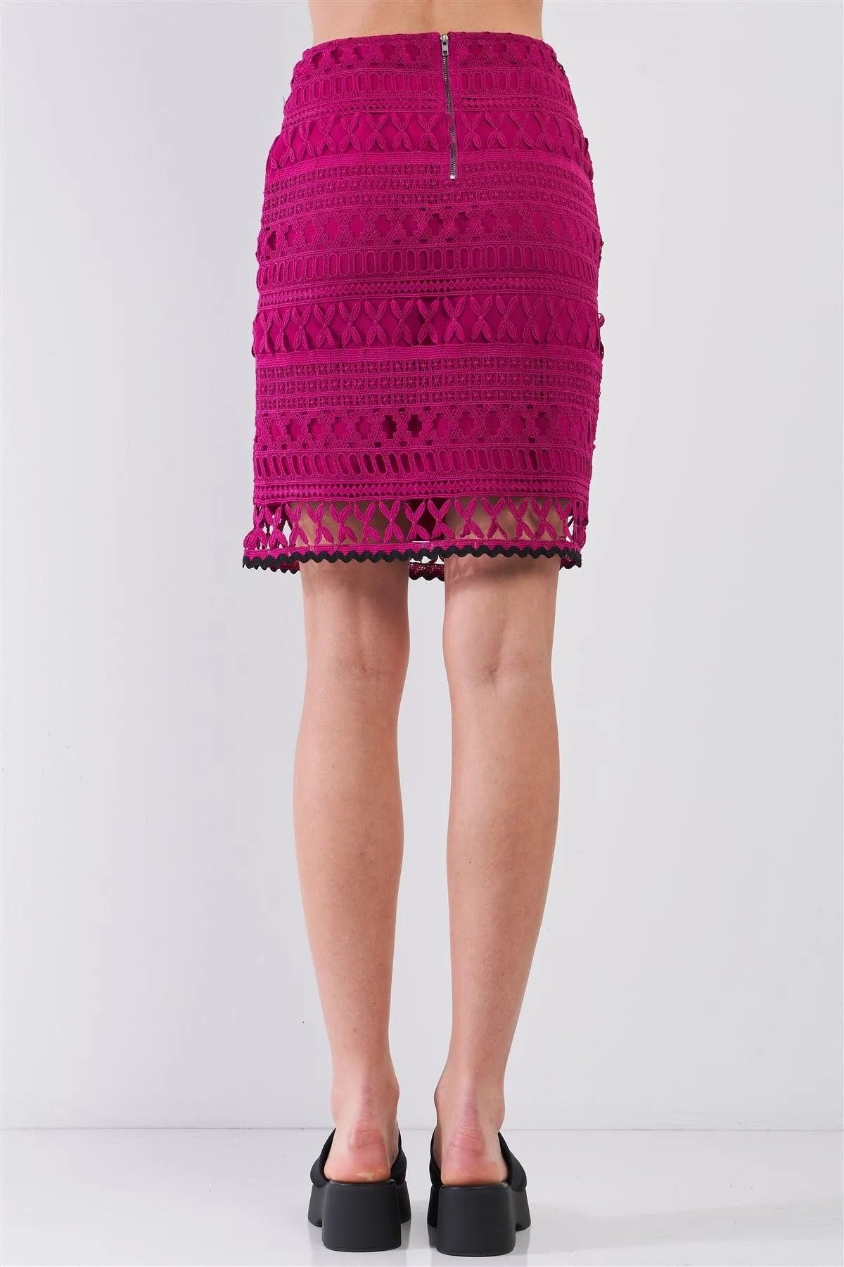 🖤 Item Features: Dark magenta, solid color, crochet, high waist, back zipper closure, black bottom hem detail, pencil cut, tight fitting, lined, non-stretch, mini length, casual, cute, romantic look, spring/summer collection