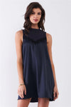 Dark Navy Combined Sleeveless Satin Front Lace Trim Mock Neck Mini Dress /1-2-2-1