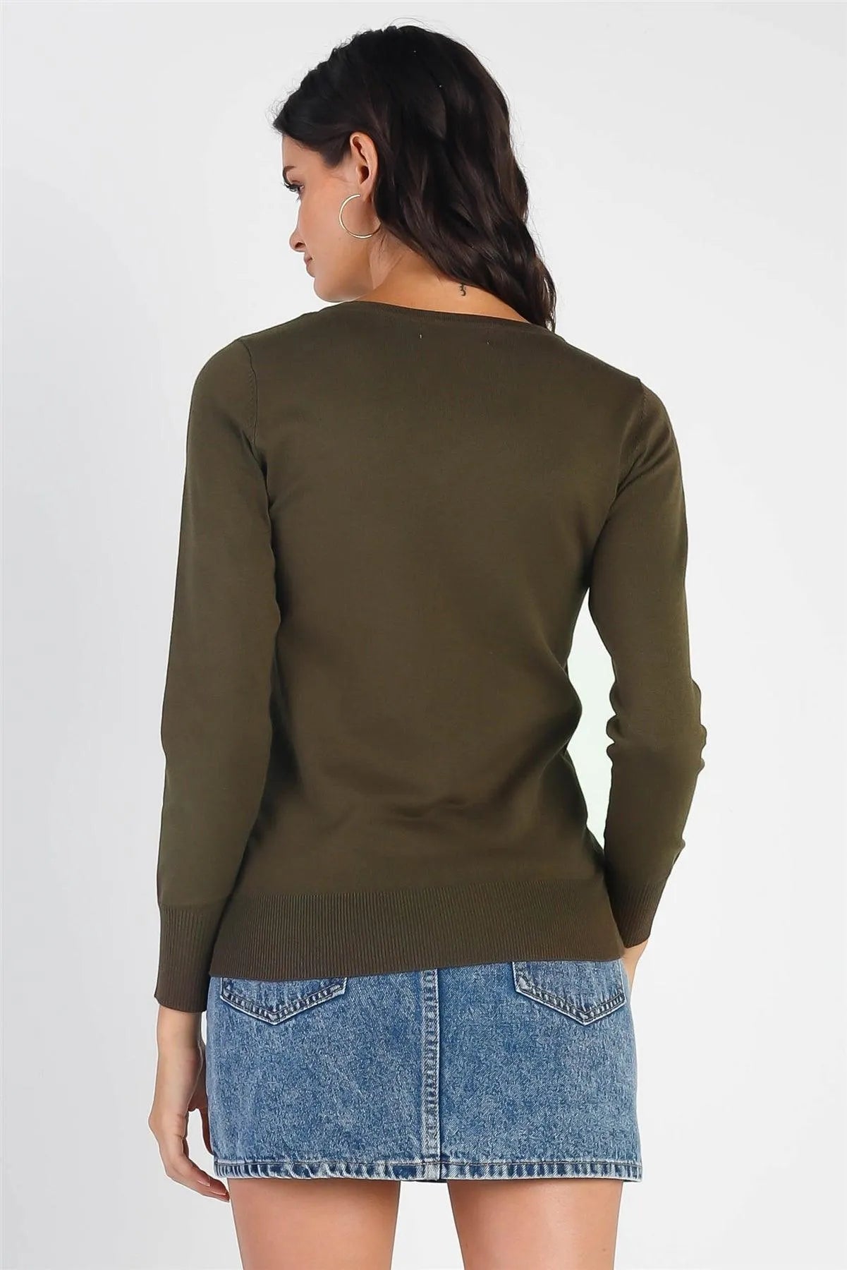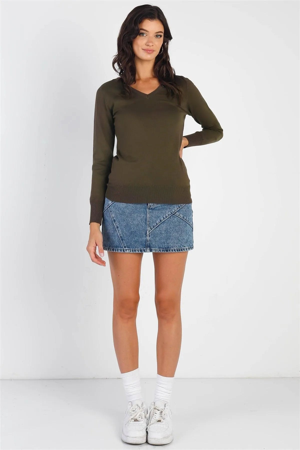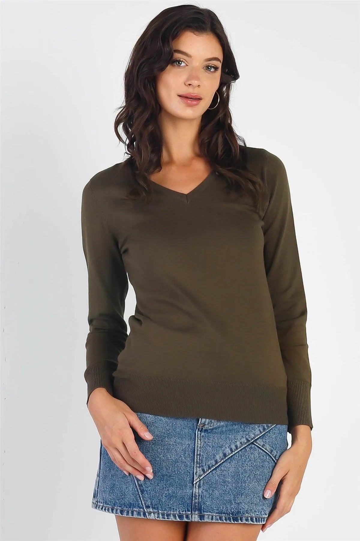 Dark Olive Knit V-Neck Long Sleeve Sweater /1-2-2-1