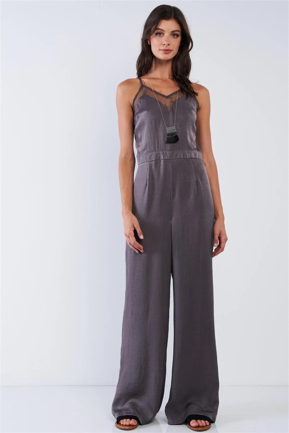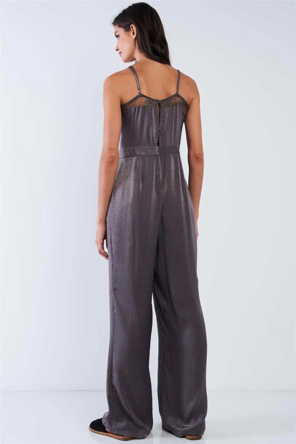 🖤 Item features: Dark olive, satin, regular fit, mesh hem v-neckline, sleeveless, adjustable straps, wide leg, floor length, invisible back zipper fly closure and two elastic loop button closures, soft to touch, casual chic, party wear, night out.