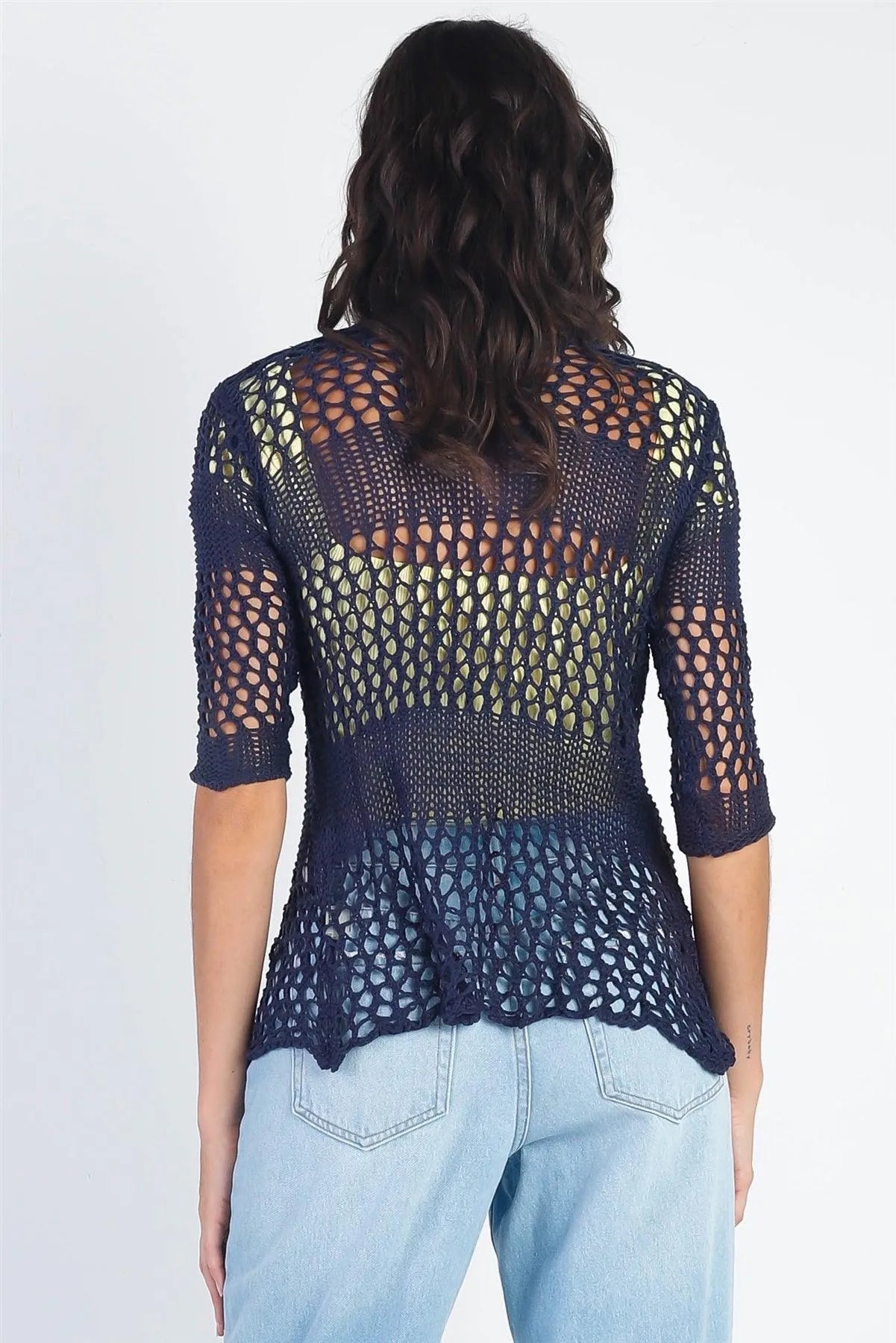🖤 Item Features: Deep blue, solid color, sheer crochet knit construction, midi sleeve, round neckline, hook&eye closure front, unlined, sheer, slight stretch, relaxed fit, casual, beach cover up, breathable, lightweight, spring/summer collection.