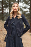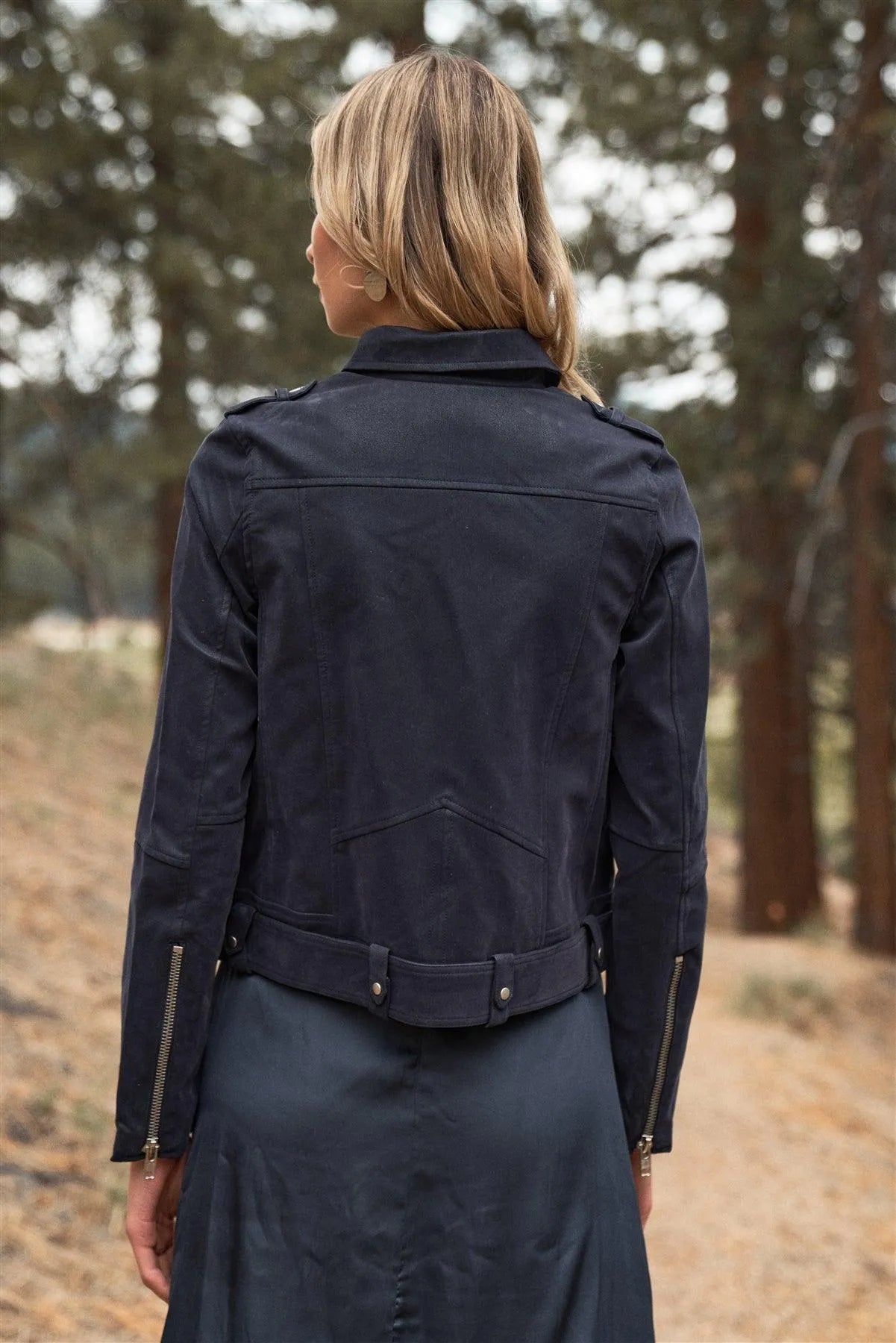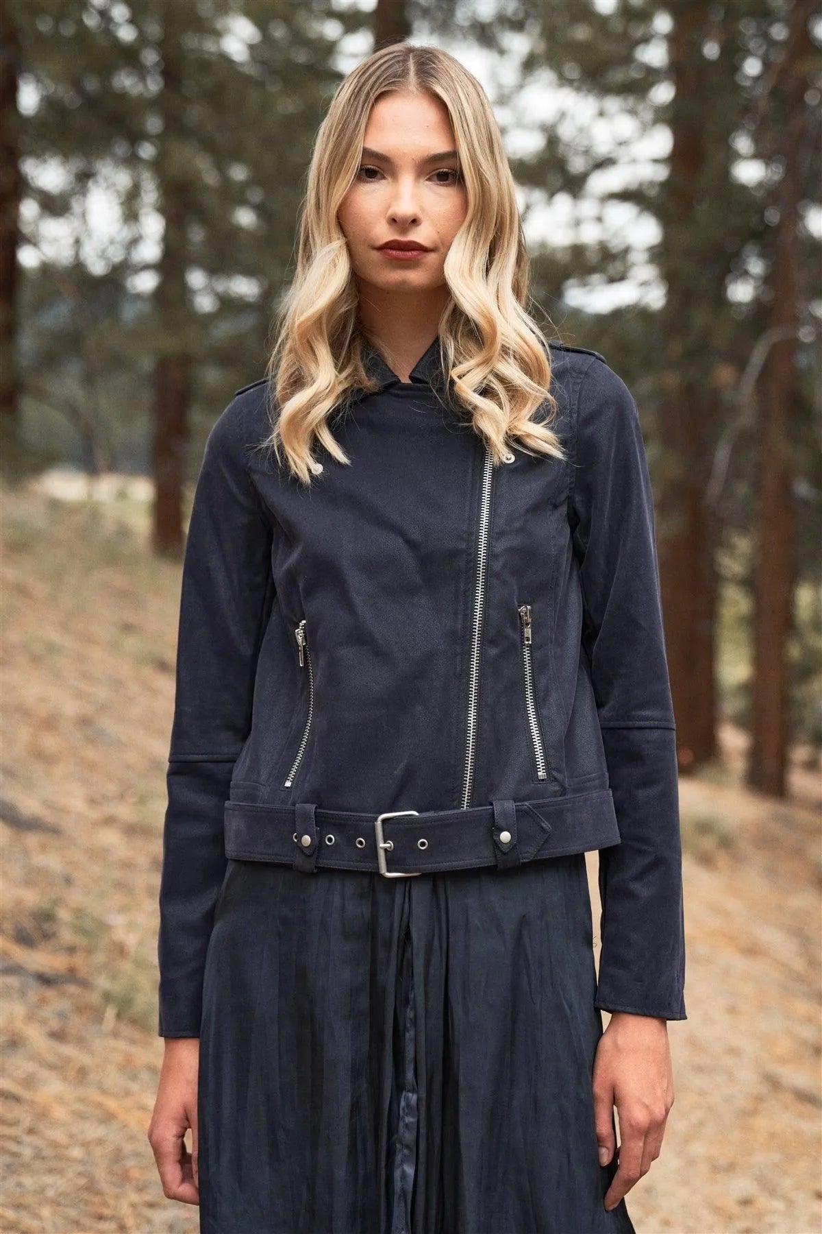 Deep Blue Faux Suede Edgy Belted Hem Biker Jacket