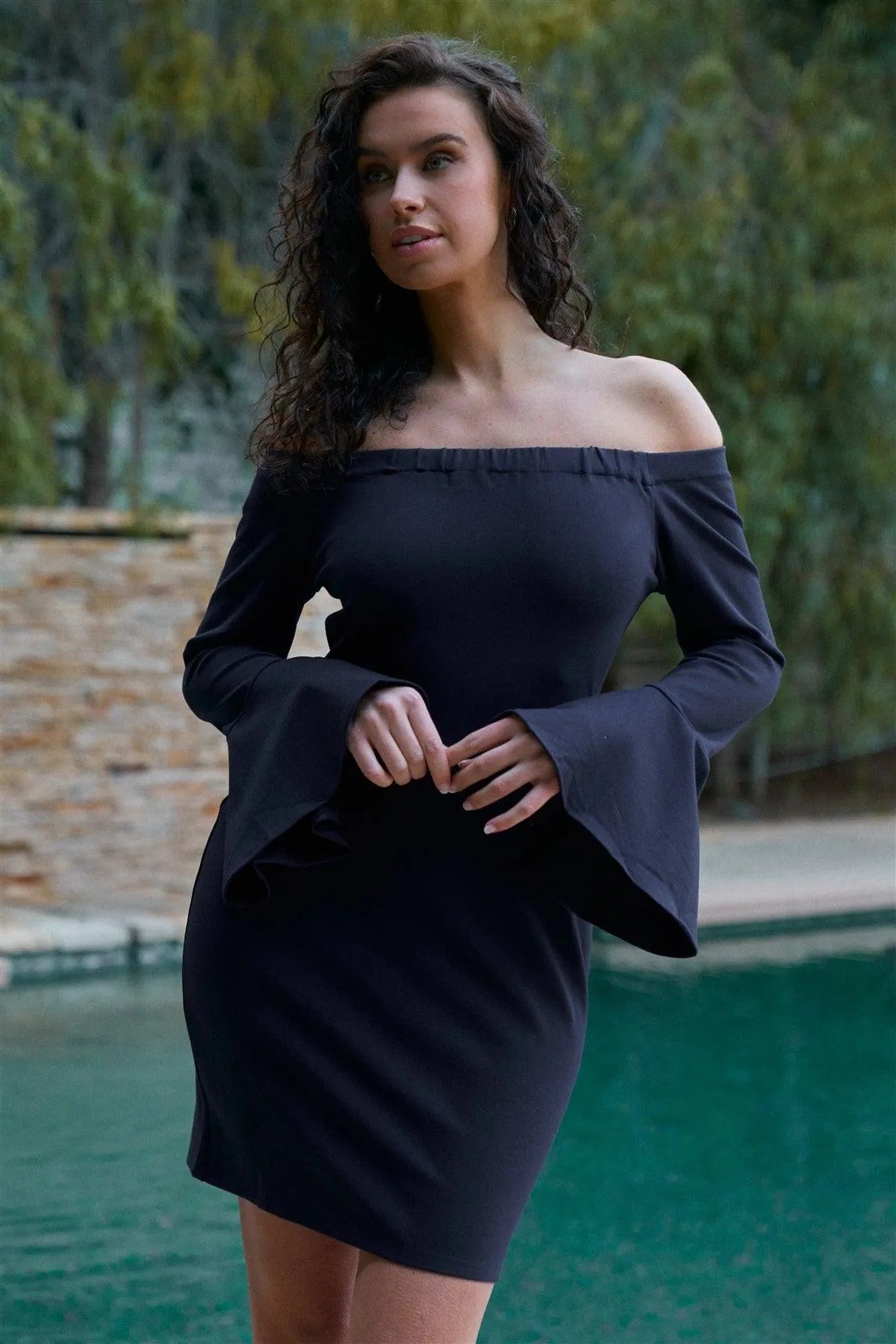 🖤Item Features: Deep navy, solid, elasticized off-the-shoulder, flare bell hem long sleeve, regular fit, stretchy, unlined, mini length, bodycon, minimalistic, casual chic, sexy, night out, date night look, party outfit, spring/summer collection