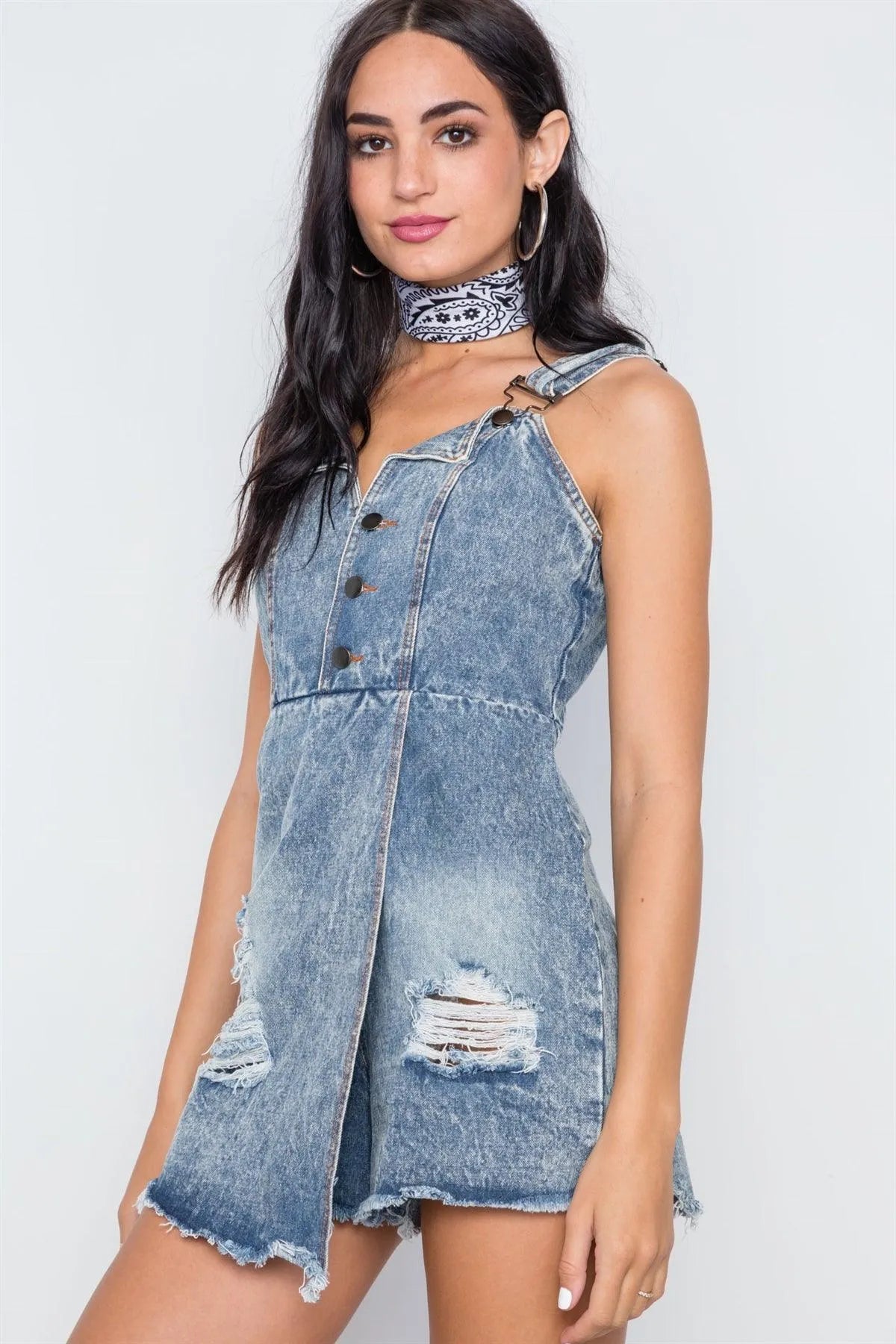 Denim Blue Distressed Frayed Hem Romper /1-1-2-1
