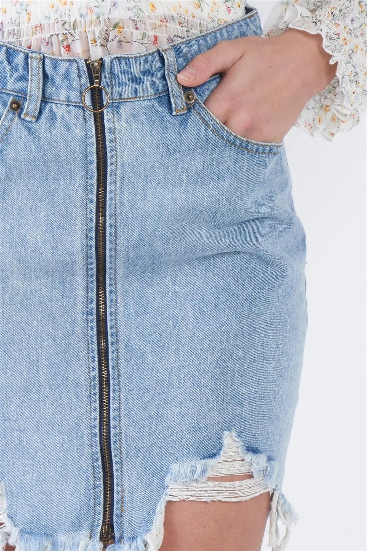 Denim Blue Front Zipper Shark Bite Raw Hem Mini Skirt /3-2-1