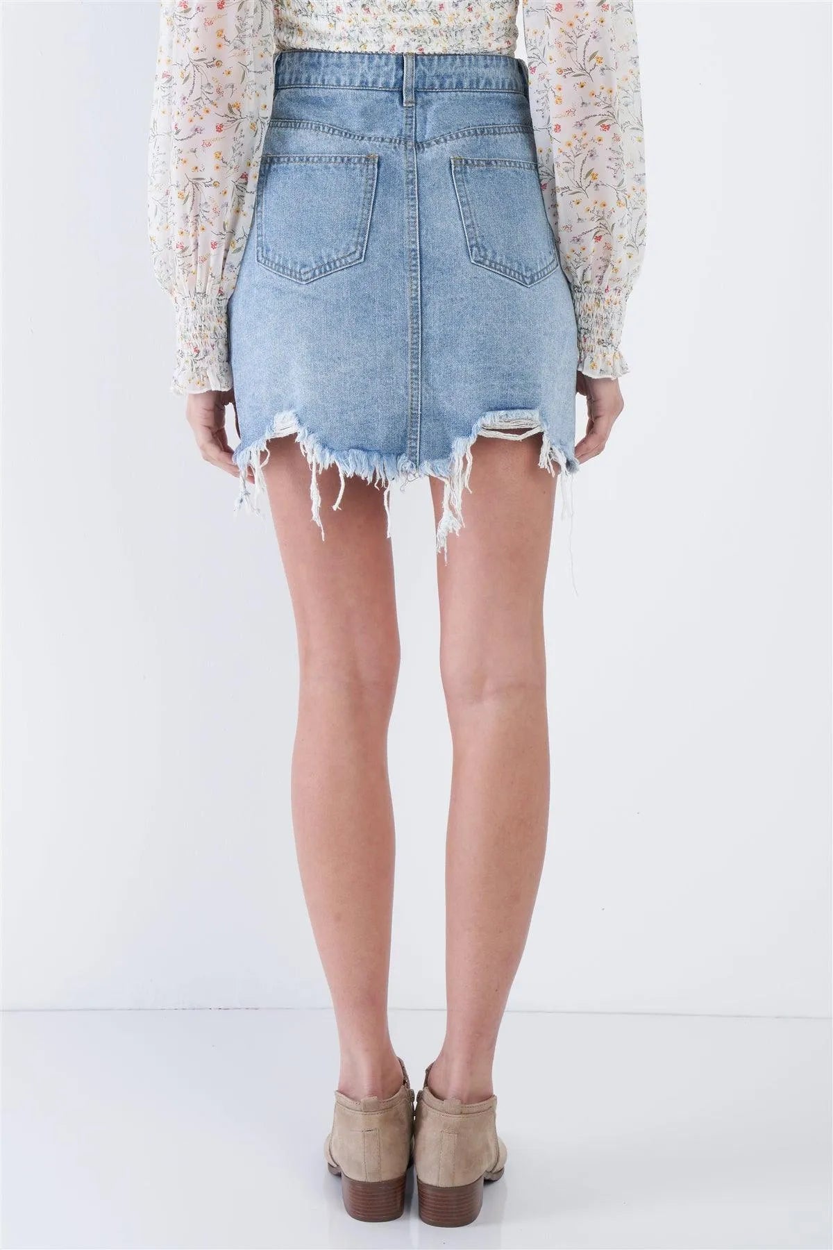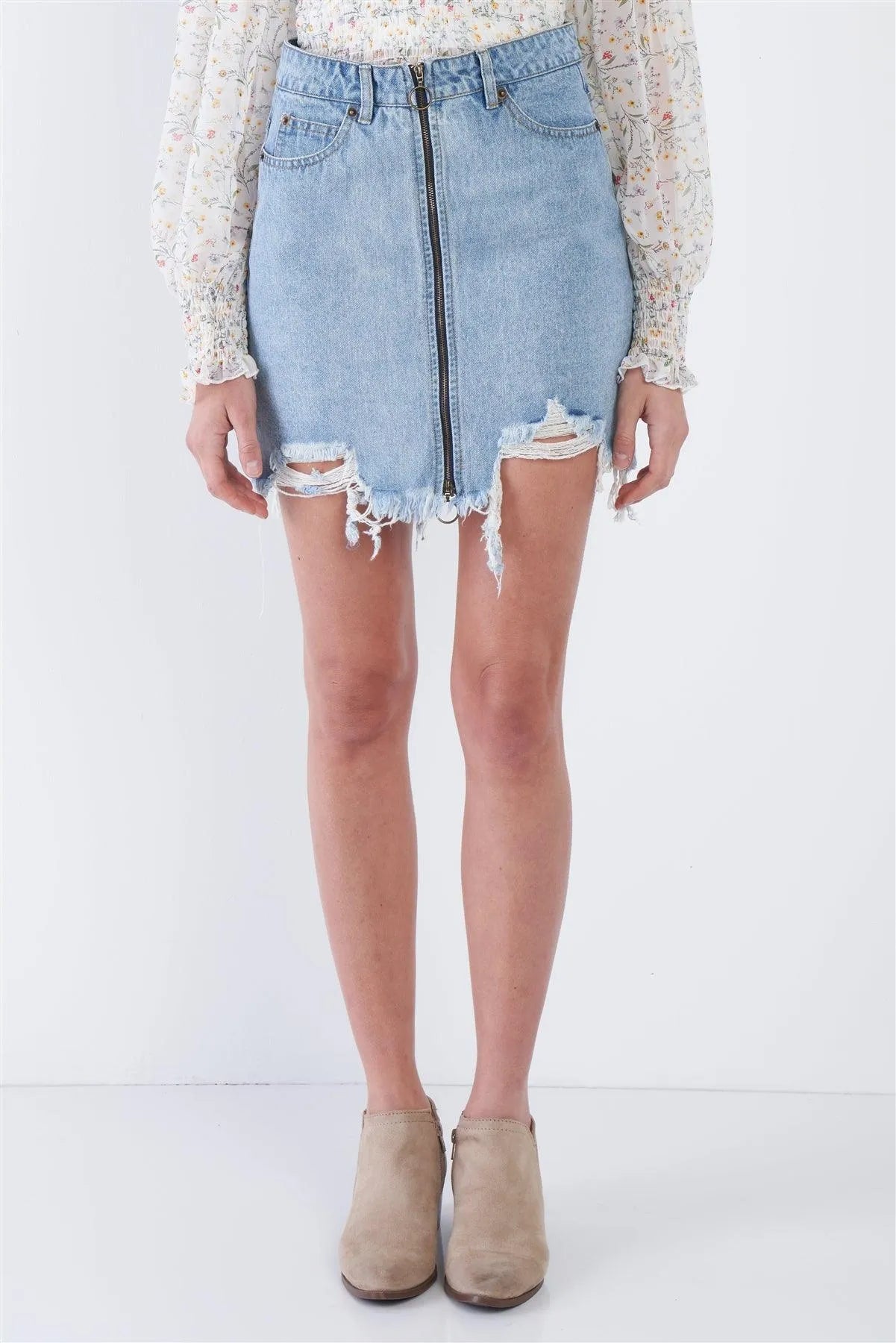Denim Blue Front Zipper Shark Bite Raw Hem Mini Skirt /4-2-1