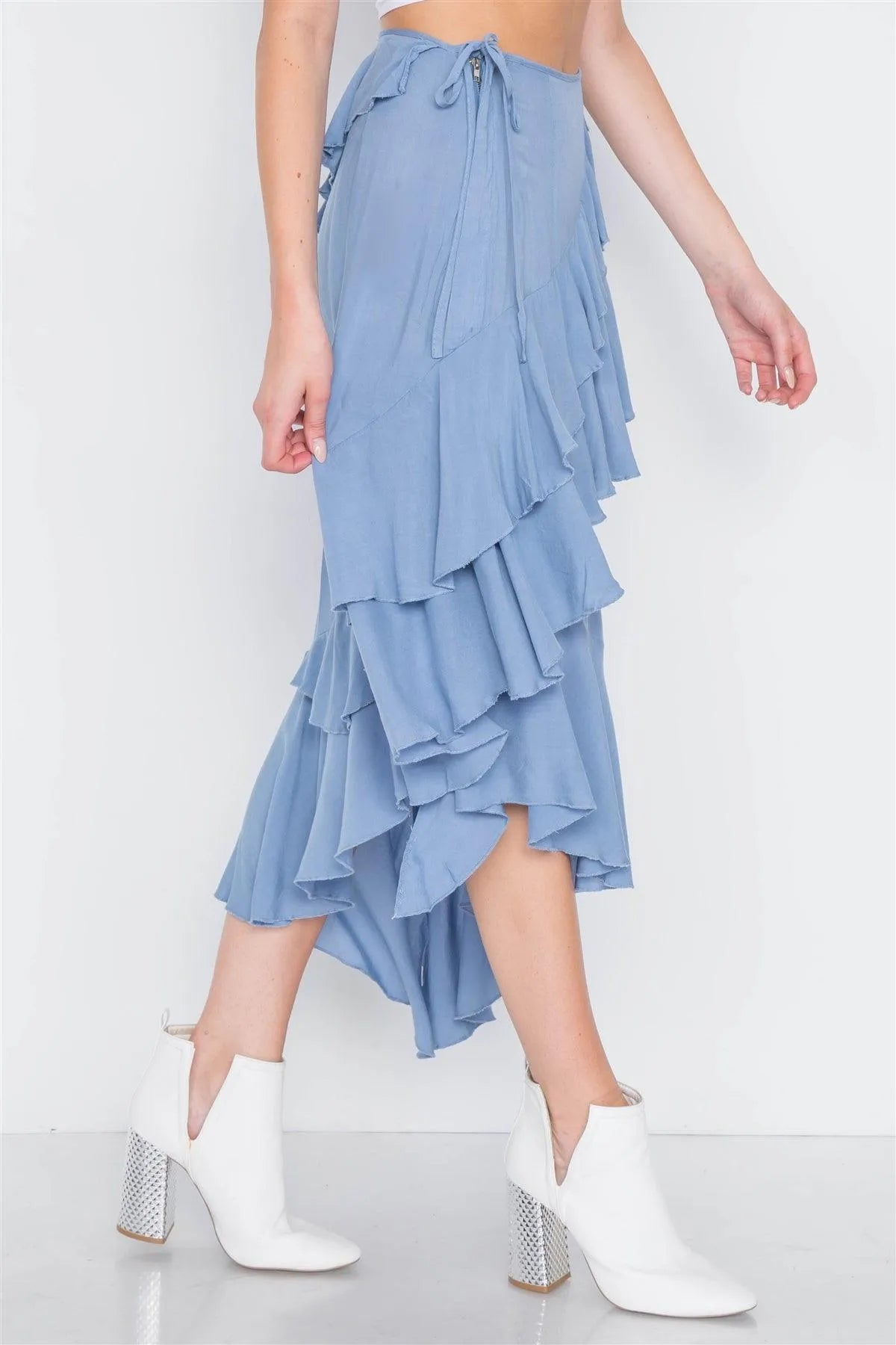 Denim Blue High-Waist Asymmetrical Flounce Midi Skirt /1-3-3