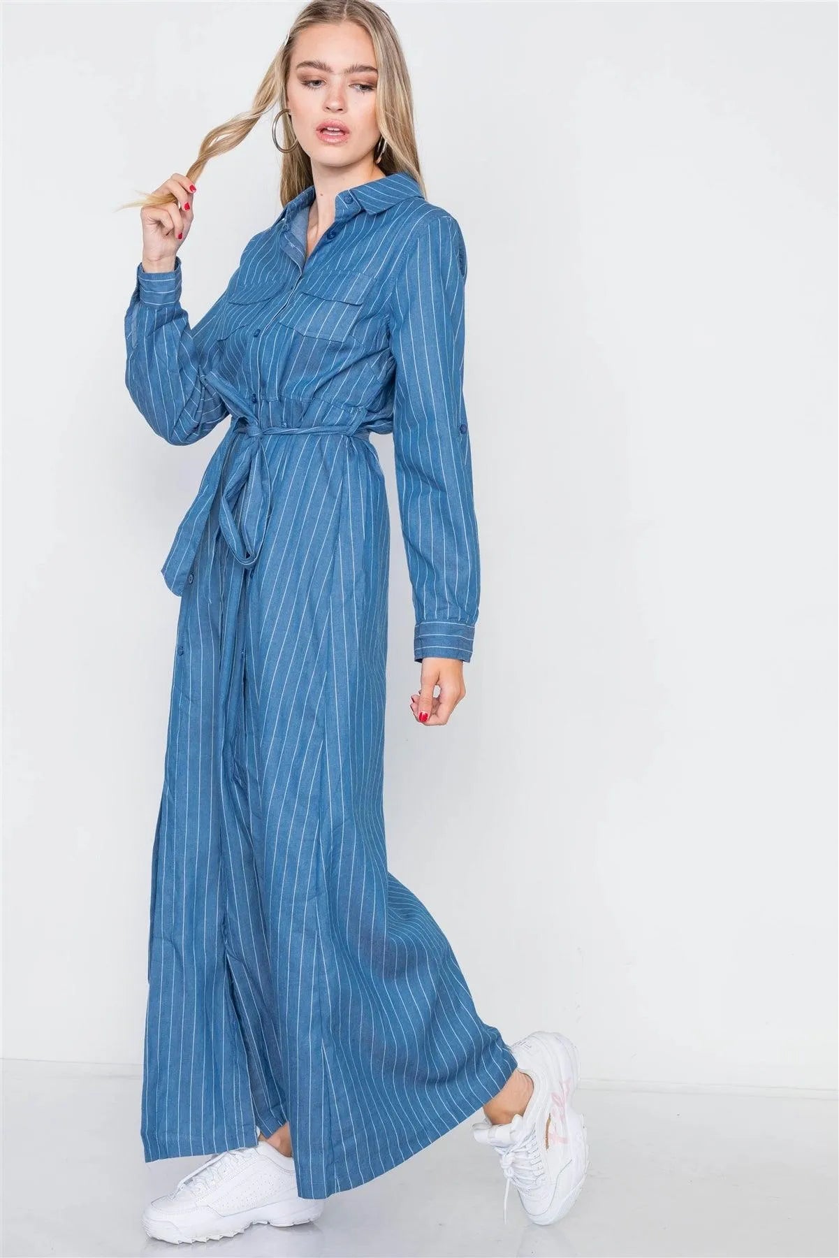 Striped Button Down Long Sleeve Collared Flowy Boutique Maxi Shirt DressVendor:Reveuse