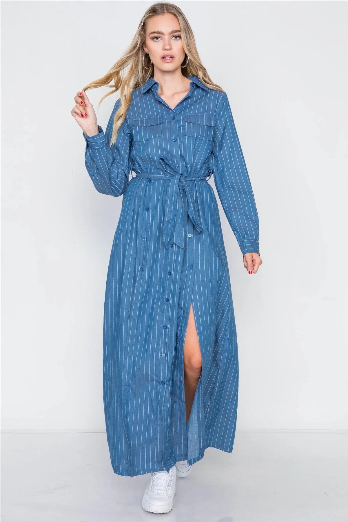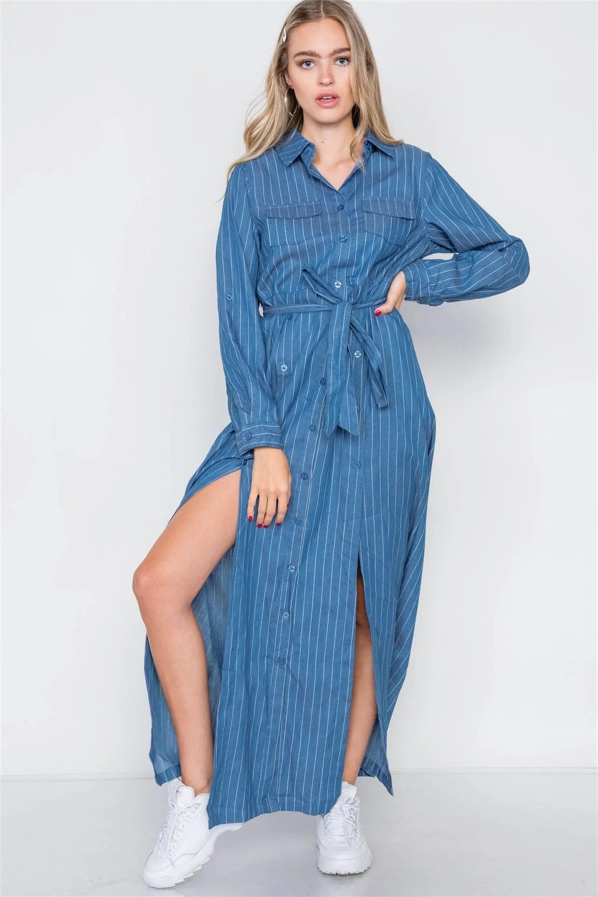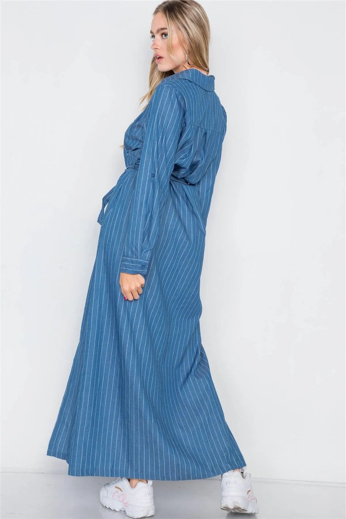 Denim Blue Stripe M-Slit Button Maxi Shirt Dress /2-2-2