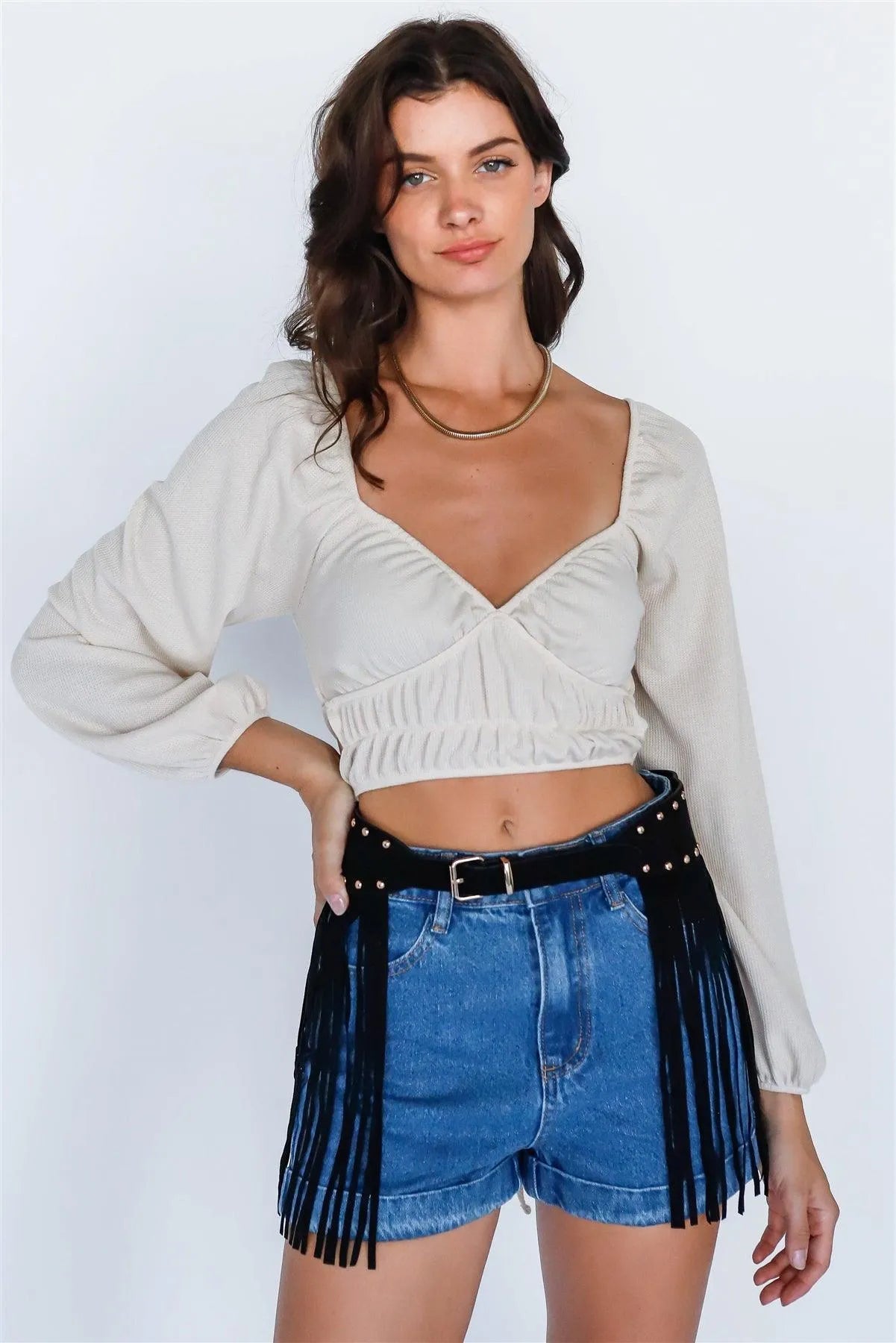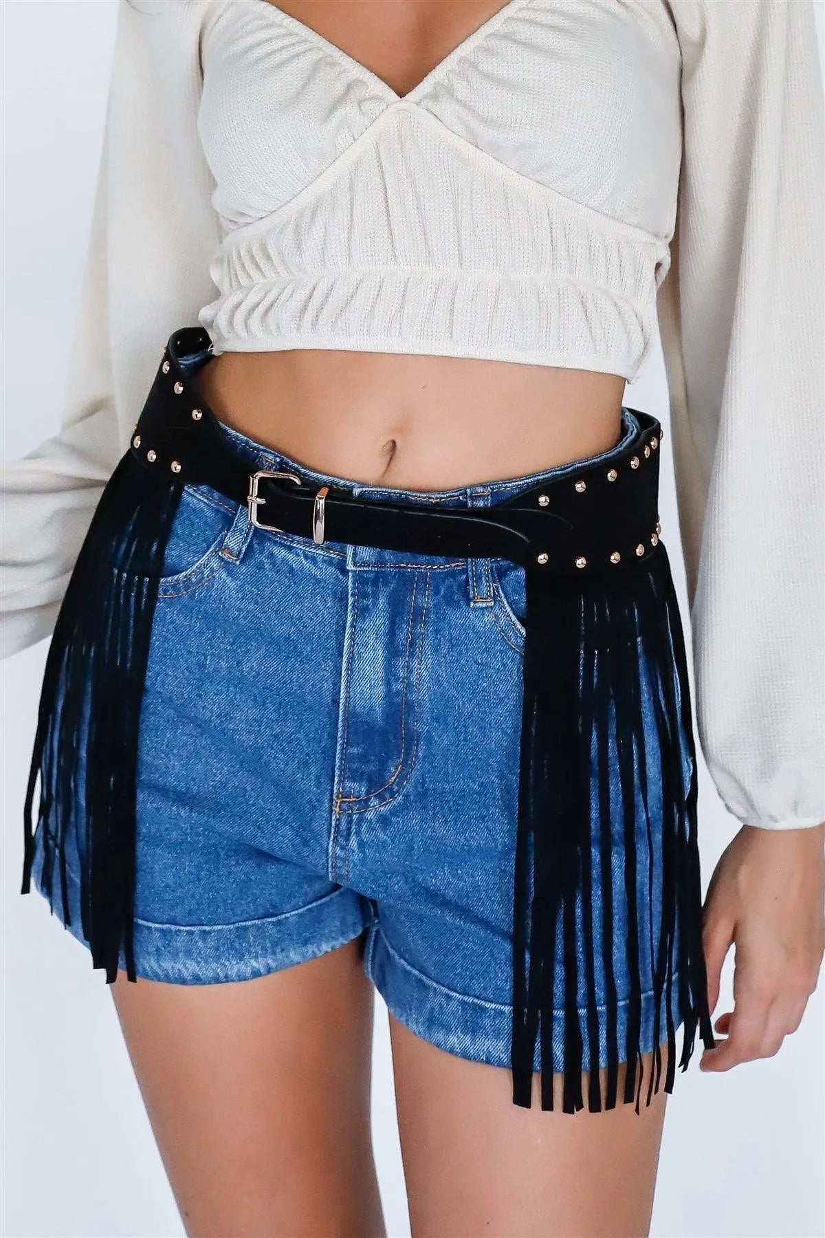 Denim Cotton High Rise Shorts & Faux Suede Fringe Studded Belt Set /3-2-1