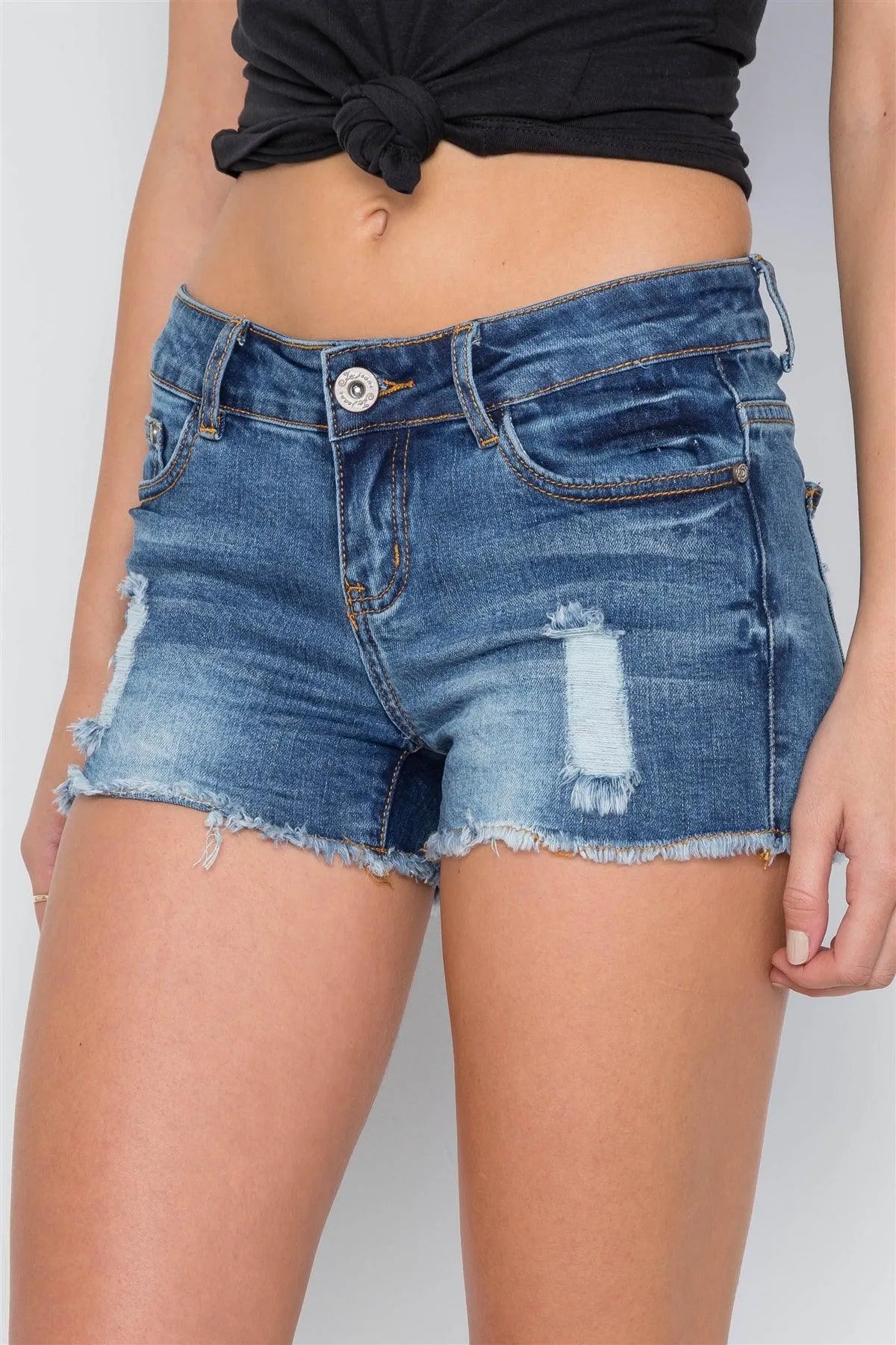 Medium Blue Denim Distressed Frayed Hem Mid-Rise Short