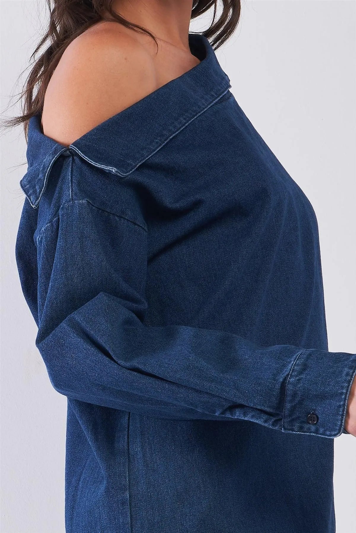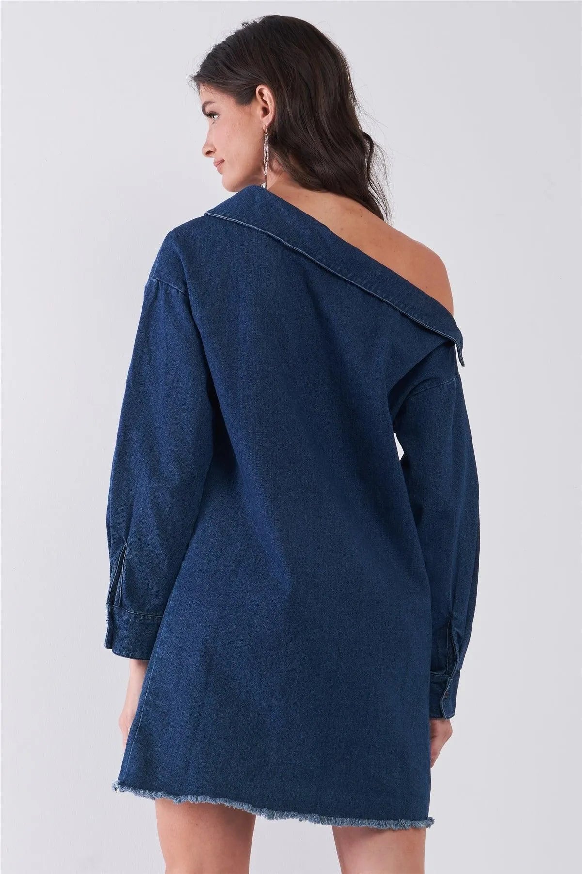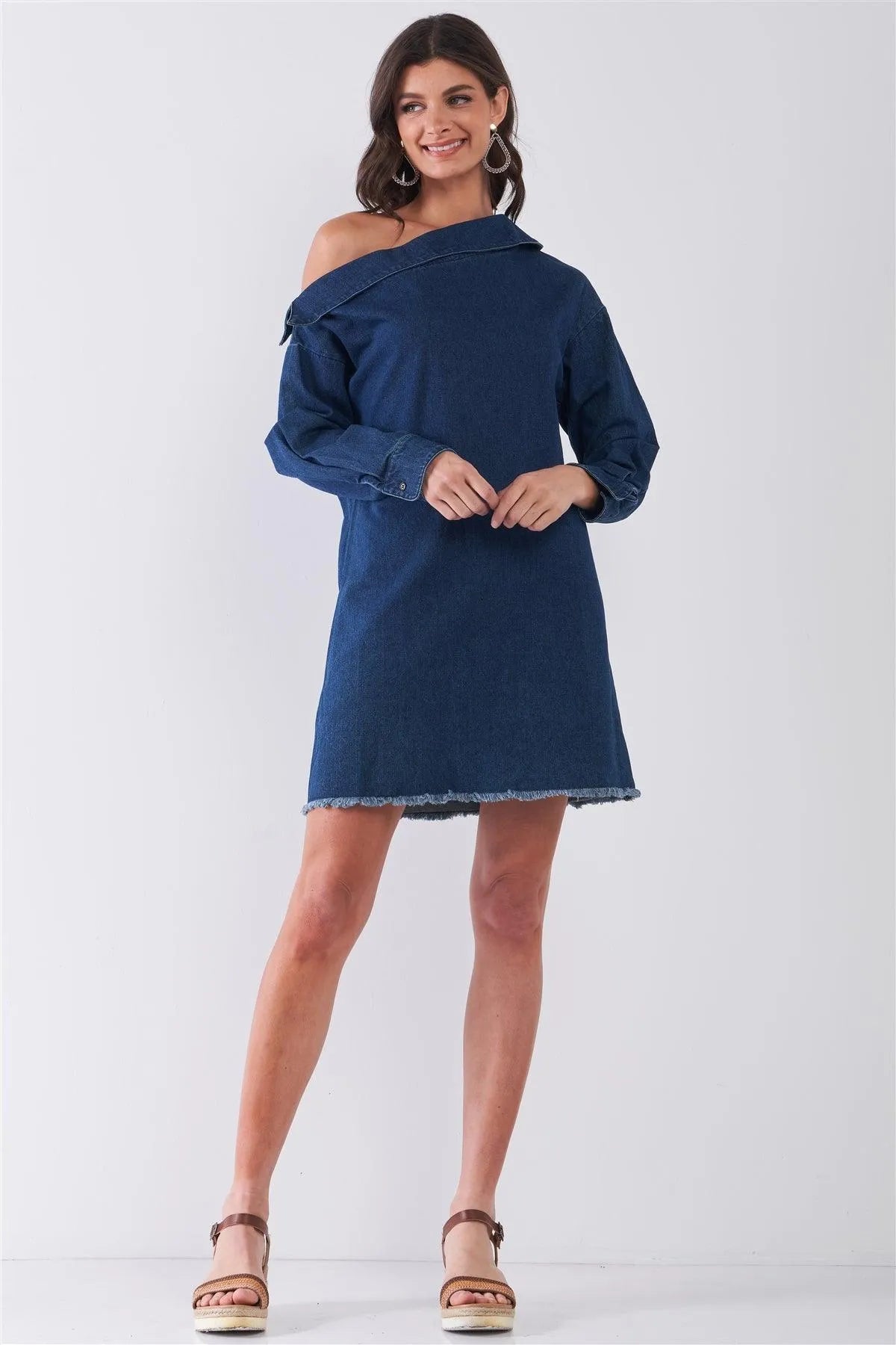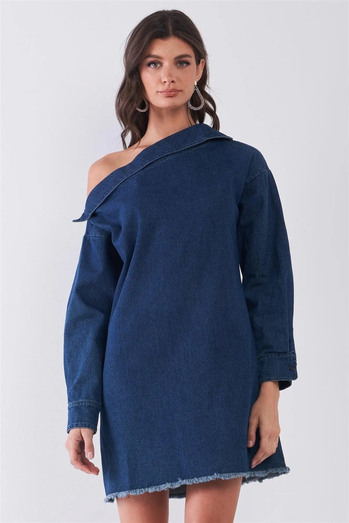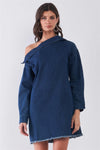 Medium Blue Denim Lapeled One-Shoulder Detail Long Sleeve Raw Hem Mini Dress