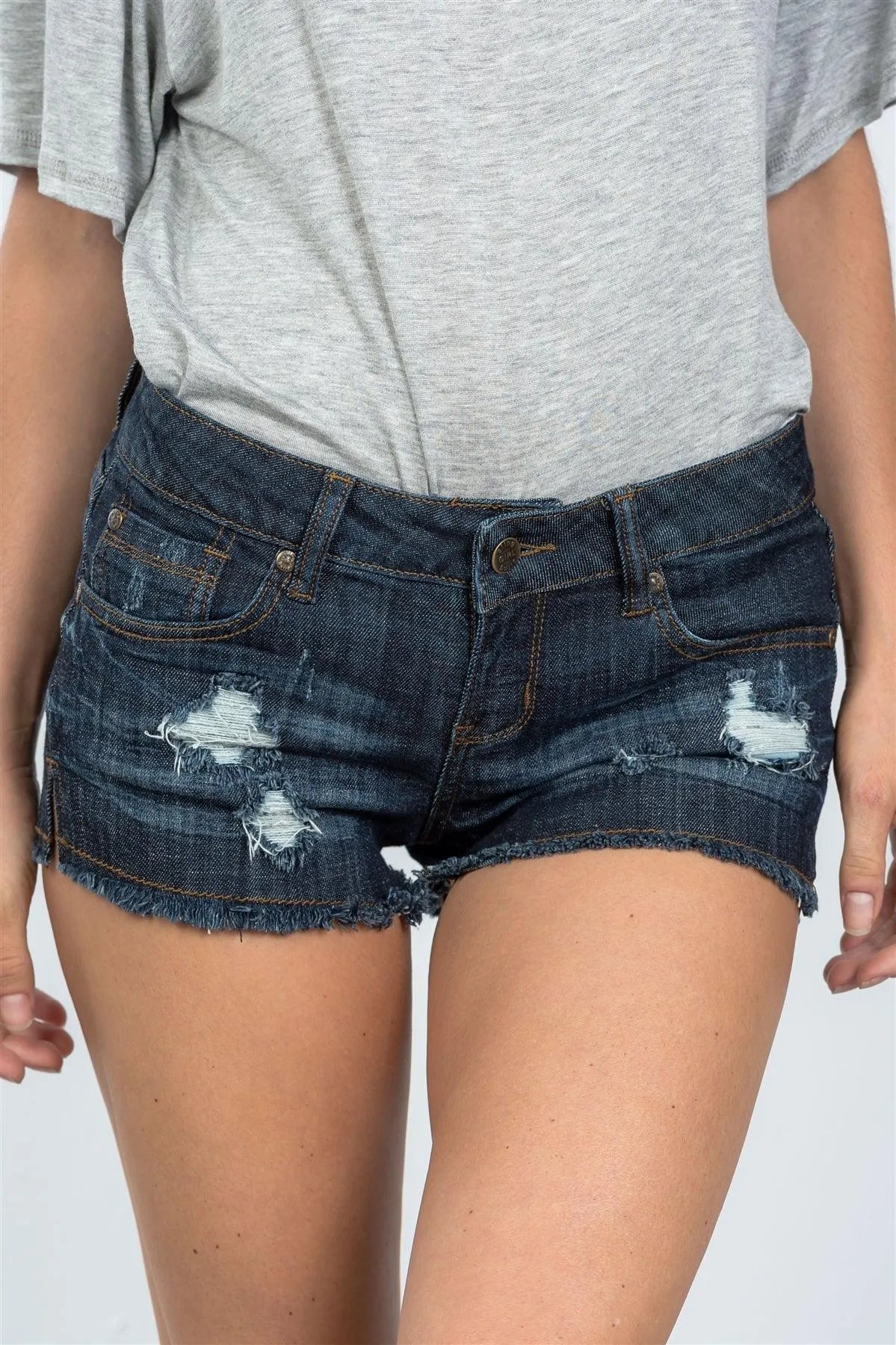 Shorts features: mini length, front and back distressed detail, raw hem, side slit, belt loops, five pockets, front button and zipper closure, mid-rise. Model is 5'9 and wearing a Small (Waist 24", Bust 34B, Hips 37")Item Measurements: Length: 11", Waist: 27", Rise: 8"