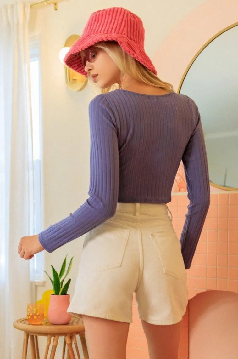 Denim Ribbed Surplice Neck Long Sleeve Crop Top