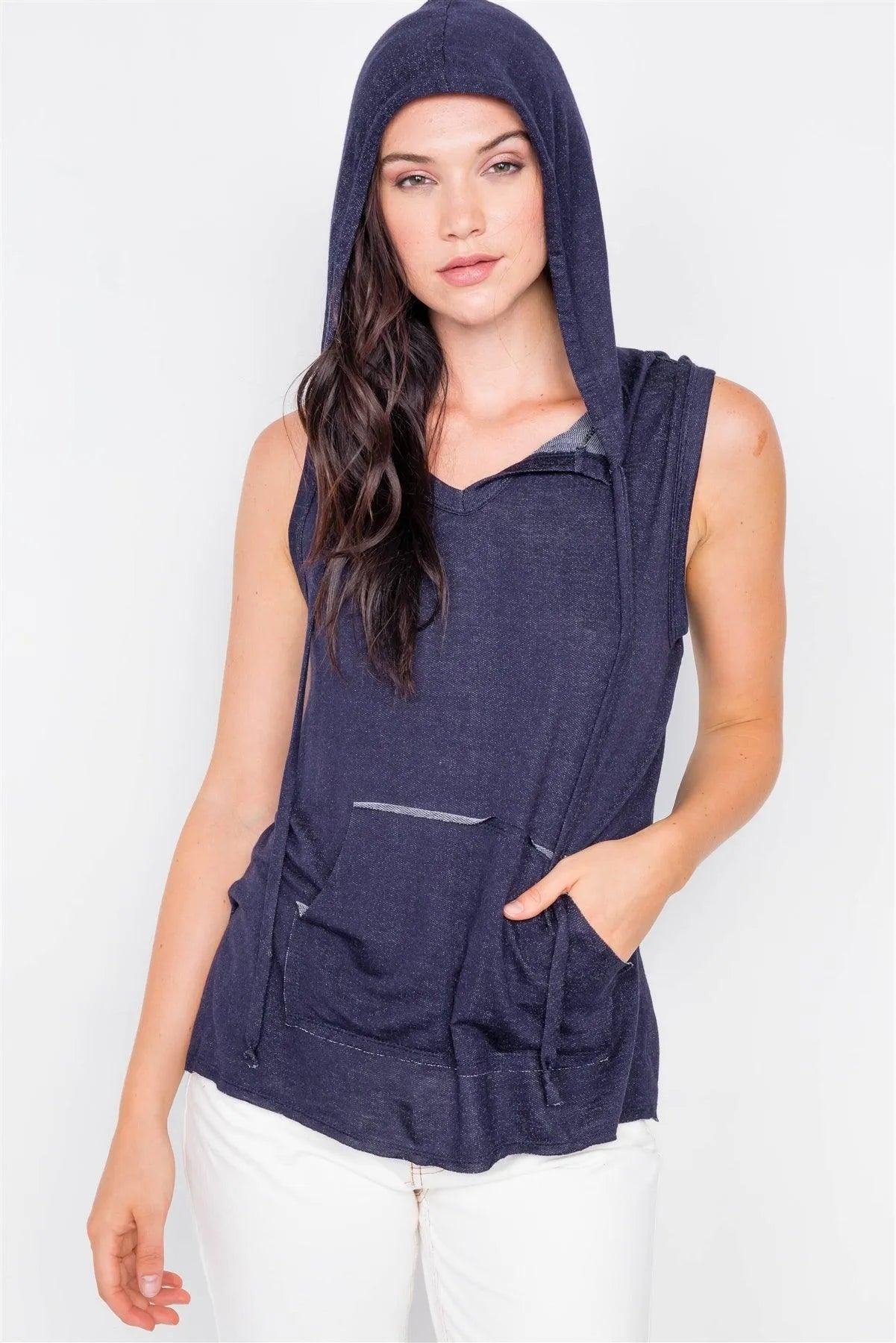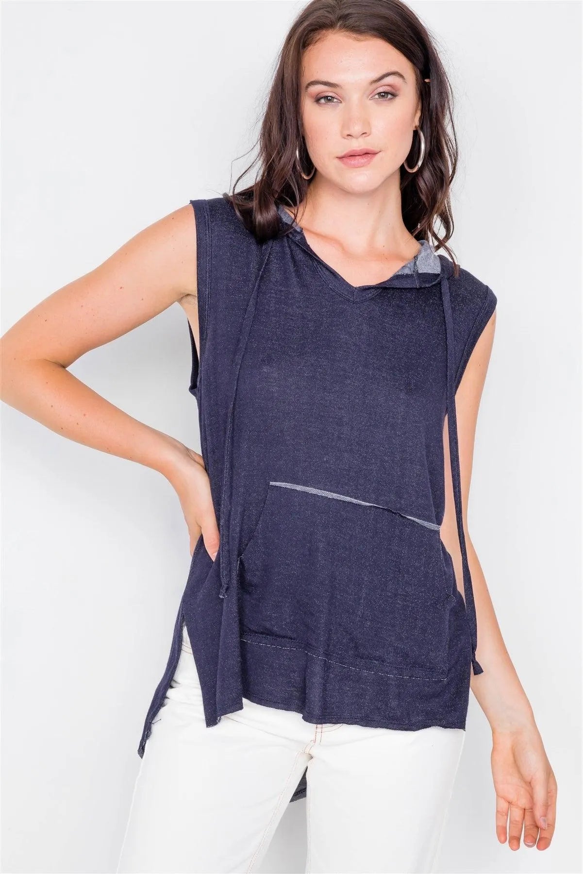 Denim Sleeveless Hooded Front Pocket Muscle Top /2-2-2