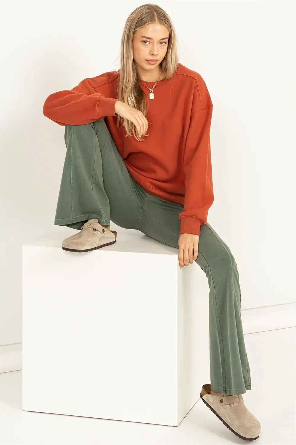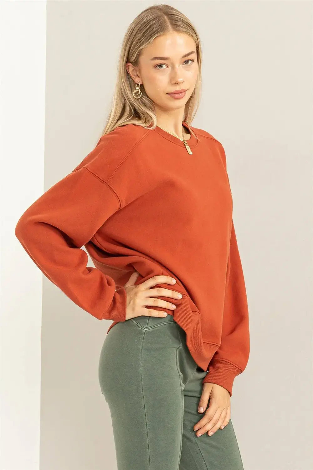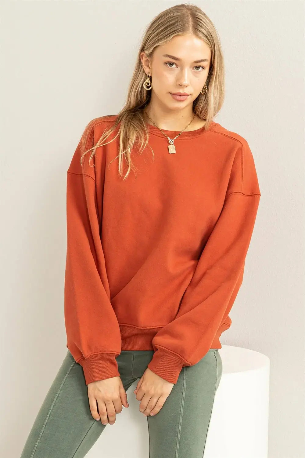 Transform your boutique's casual wear selection with our irresistibly cozy Oversized Crewneck Sweatshirt in the season's hottest shade—gorgeous warm Clay! This women's oversized pullover perfectly captures that effortless, lived-in vibe your customers crave, featuring a classic crewneck design with exposed seam detailing that creates an elevated, artisanal aesthetic. Crafted from premium soft fabric in a stunning earthy rust tone, this wholesale casual sweatshirt is the perfect neutral that pairs beautifully with everything from denim to joggers. The relaxed oversized fit and comfortable construction make it an instant wardrobe staple that transitions seamlessly from lounging at home to running errands in style!