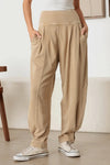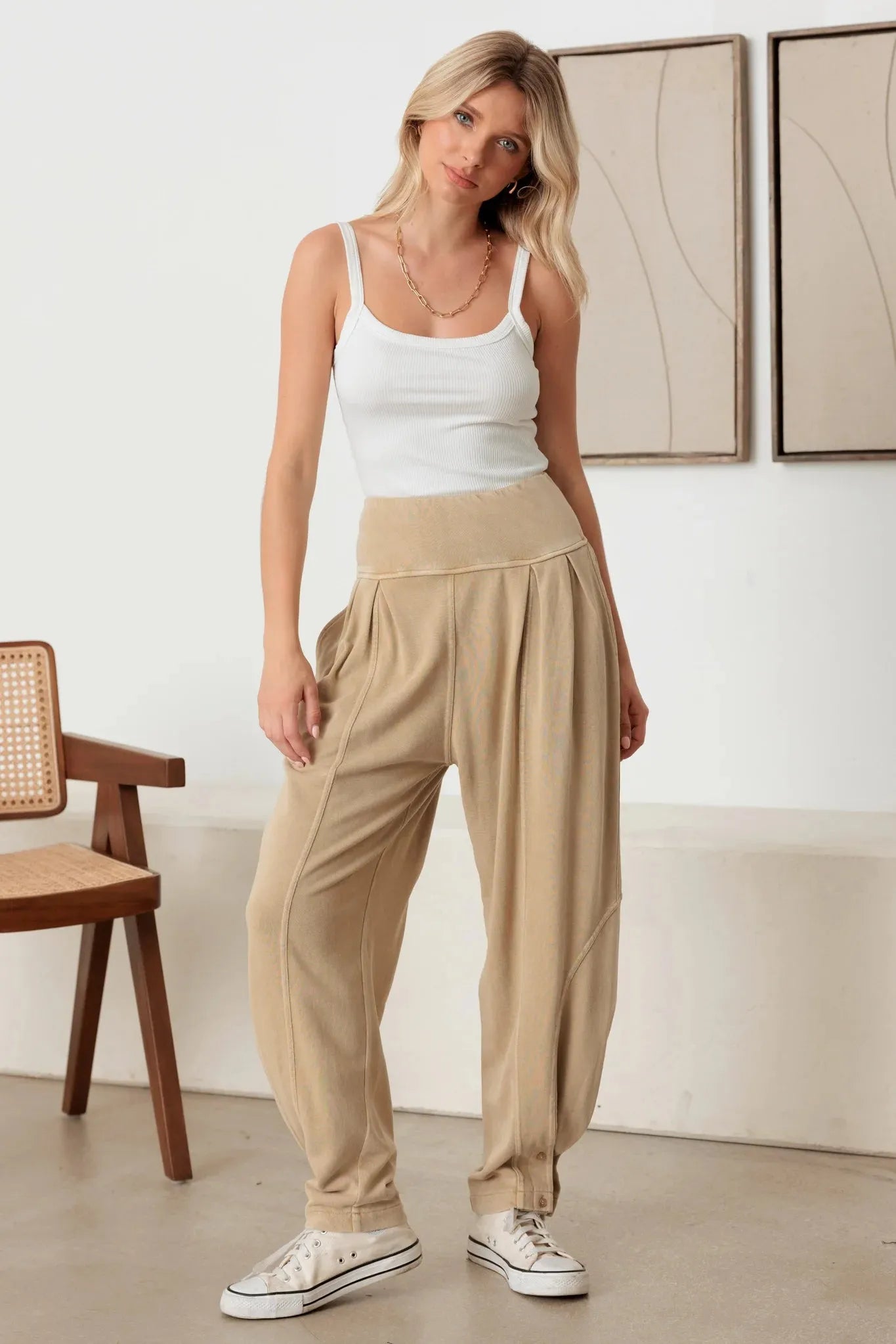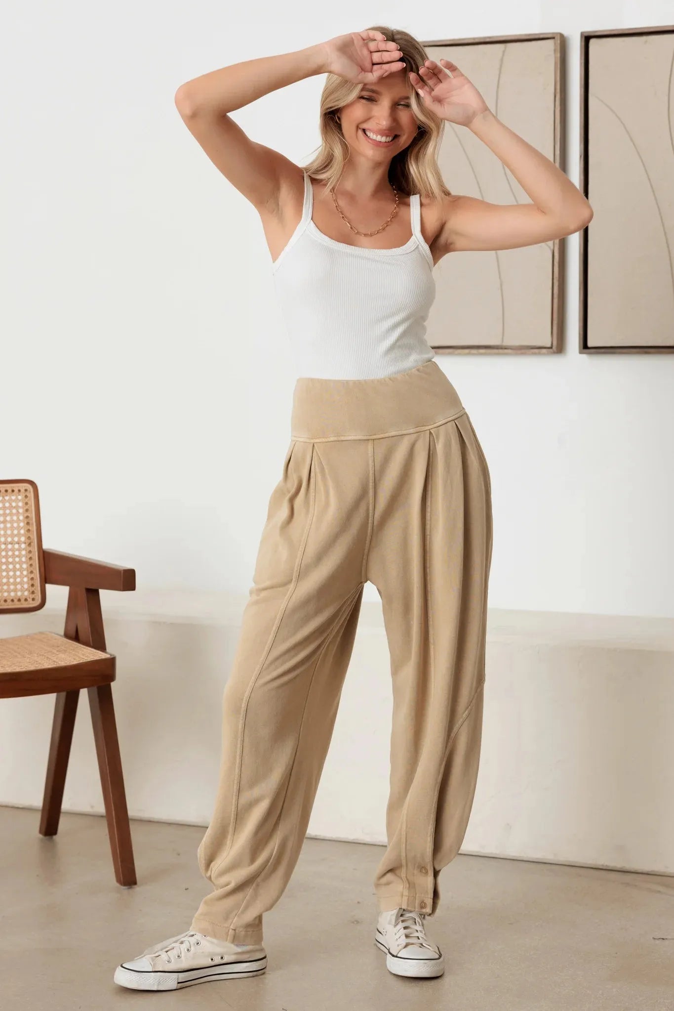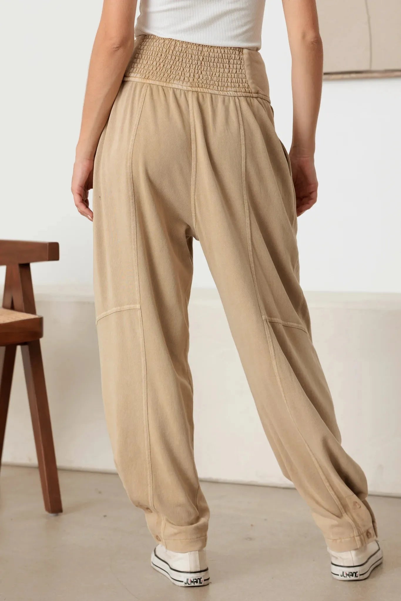 🖤 Features: Smocked high waistband, pleated front, relaxed fit, tapered legs, button cuff details, soft and stretchy fabric, neutral beige color