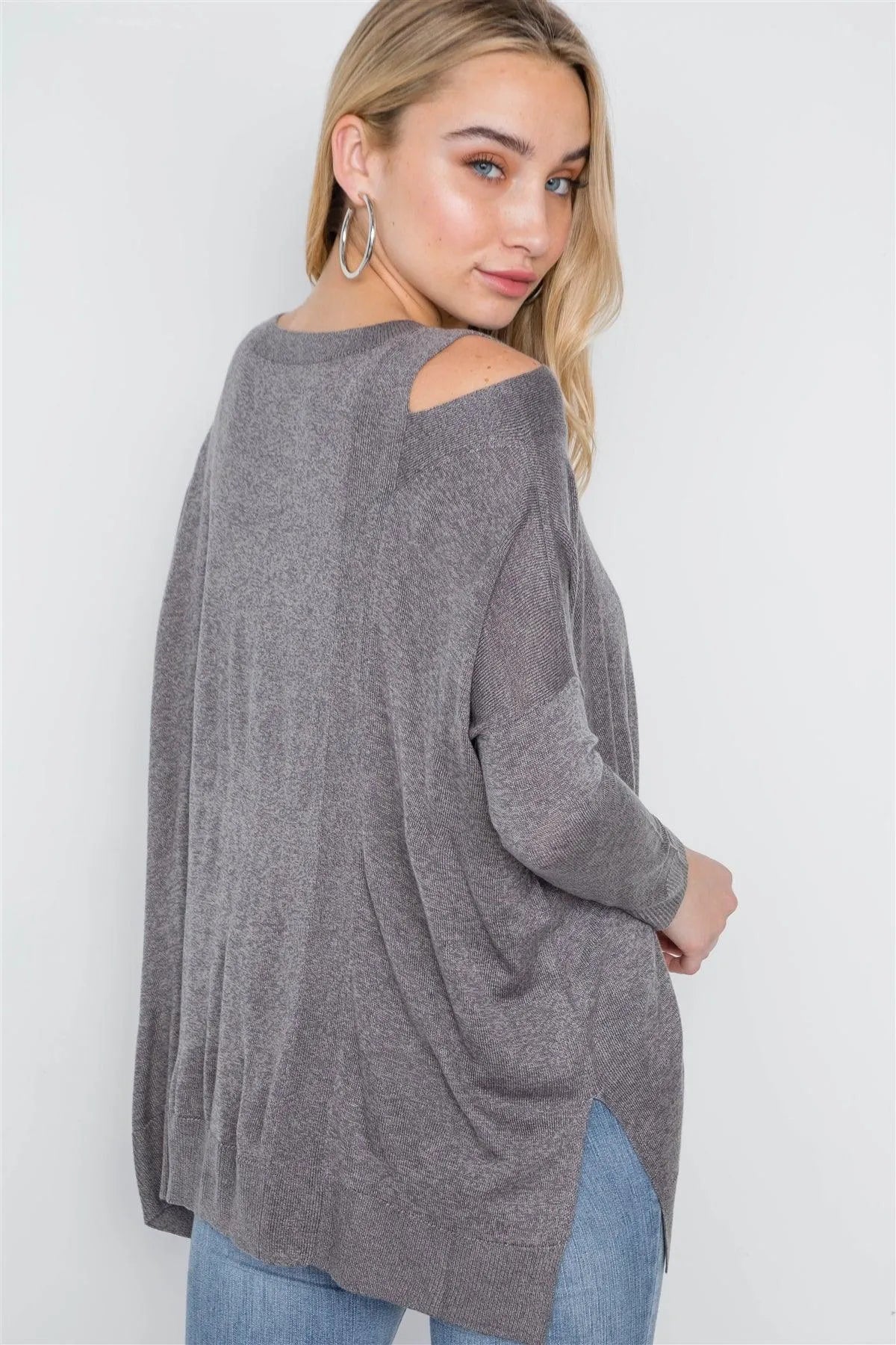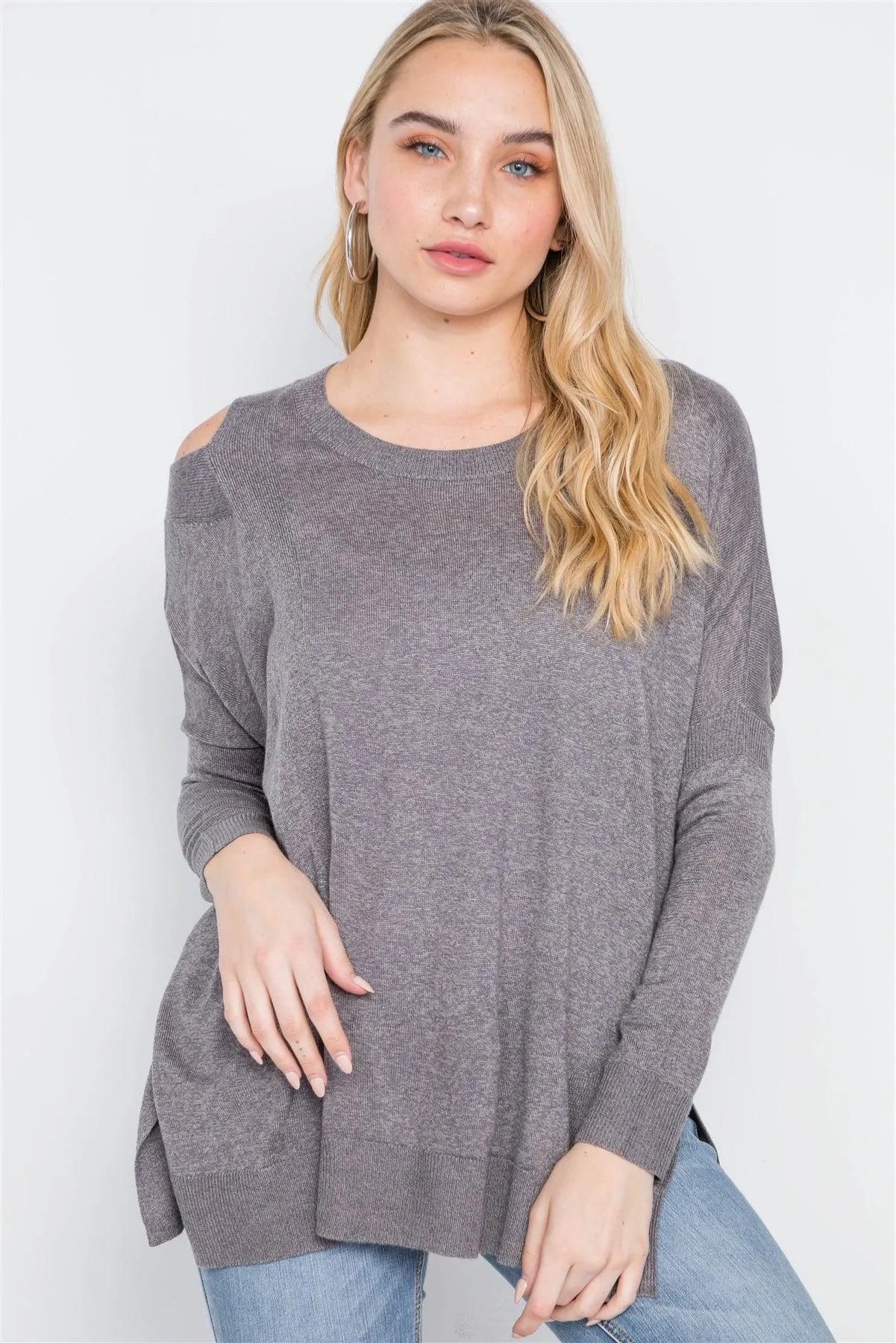 Sweater features: long sleeves, cut out detail at shoulder, dropped shoulders, side slits, ribbed cuffs and hemModel is 5'8 and wearing a Small ( Bust: 32", Waist: 25", Hips: 35")Item Measurements size Small: Length: 29", Sleeves: 14"True to size