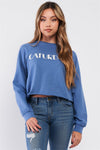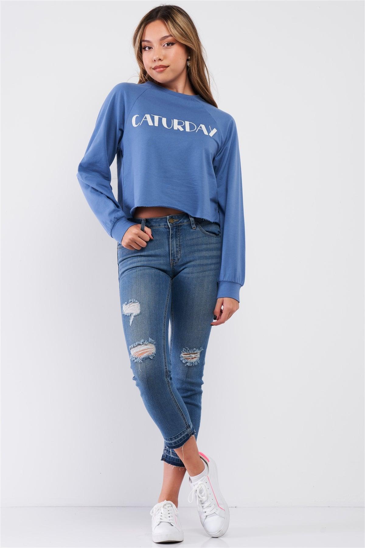 Dusty Blue Embroidered "Caturday" Long Sleeve Round Neck Cropped Sweater /3-2-1