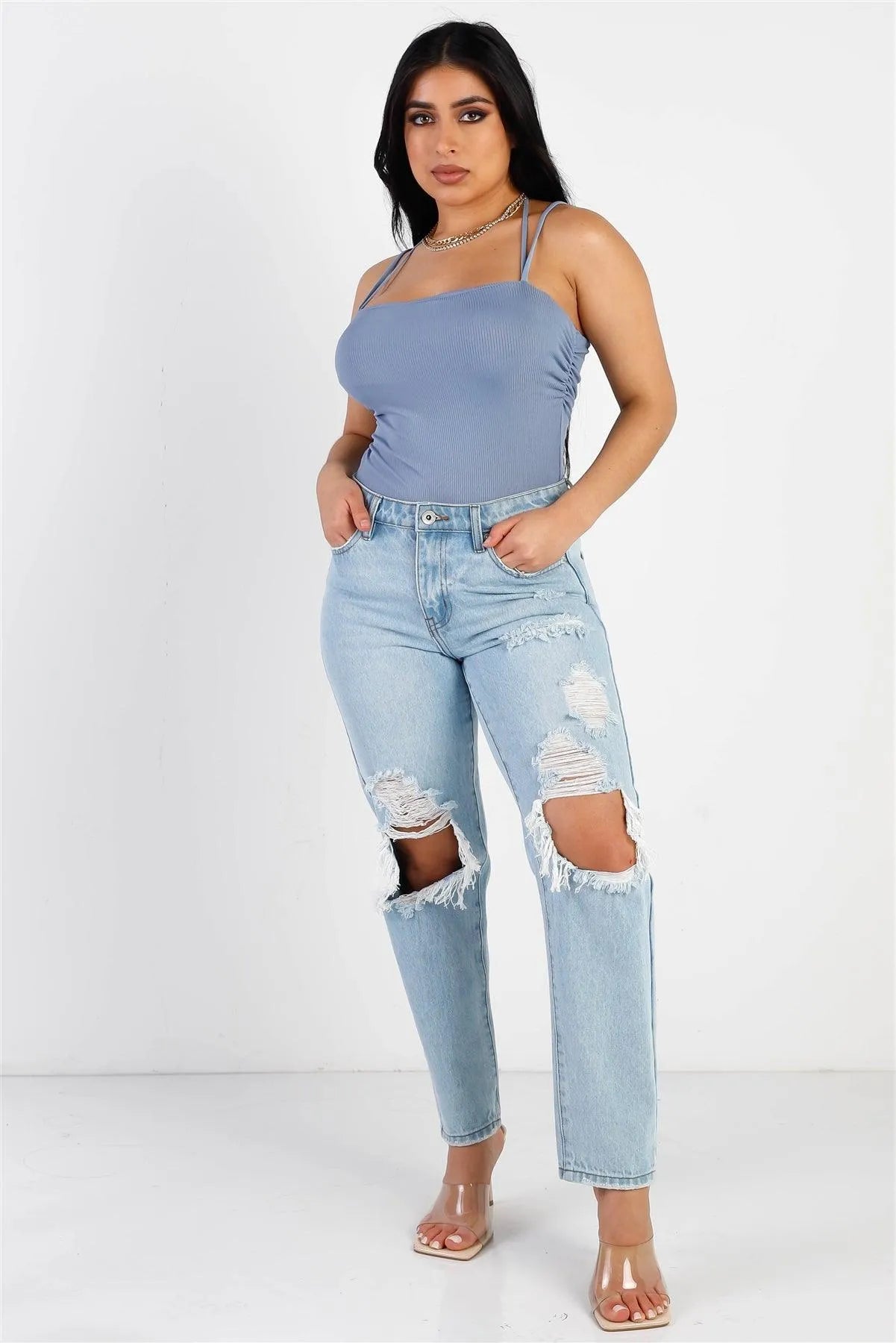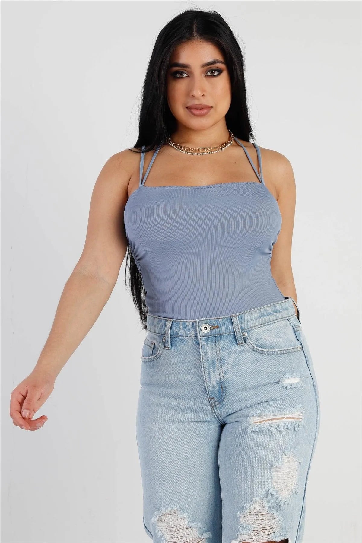 🖤 Item features: Dusty blue, solid color, ribbed material, sleeveless, side ruched details, square neckline, adjustable straps, self-tie neck detail, thong double snap closure, slim fit, unlined, non-sheer, stretchy, casual, basic, cute, girlish, must have