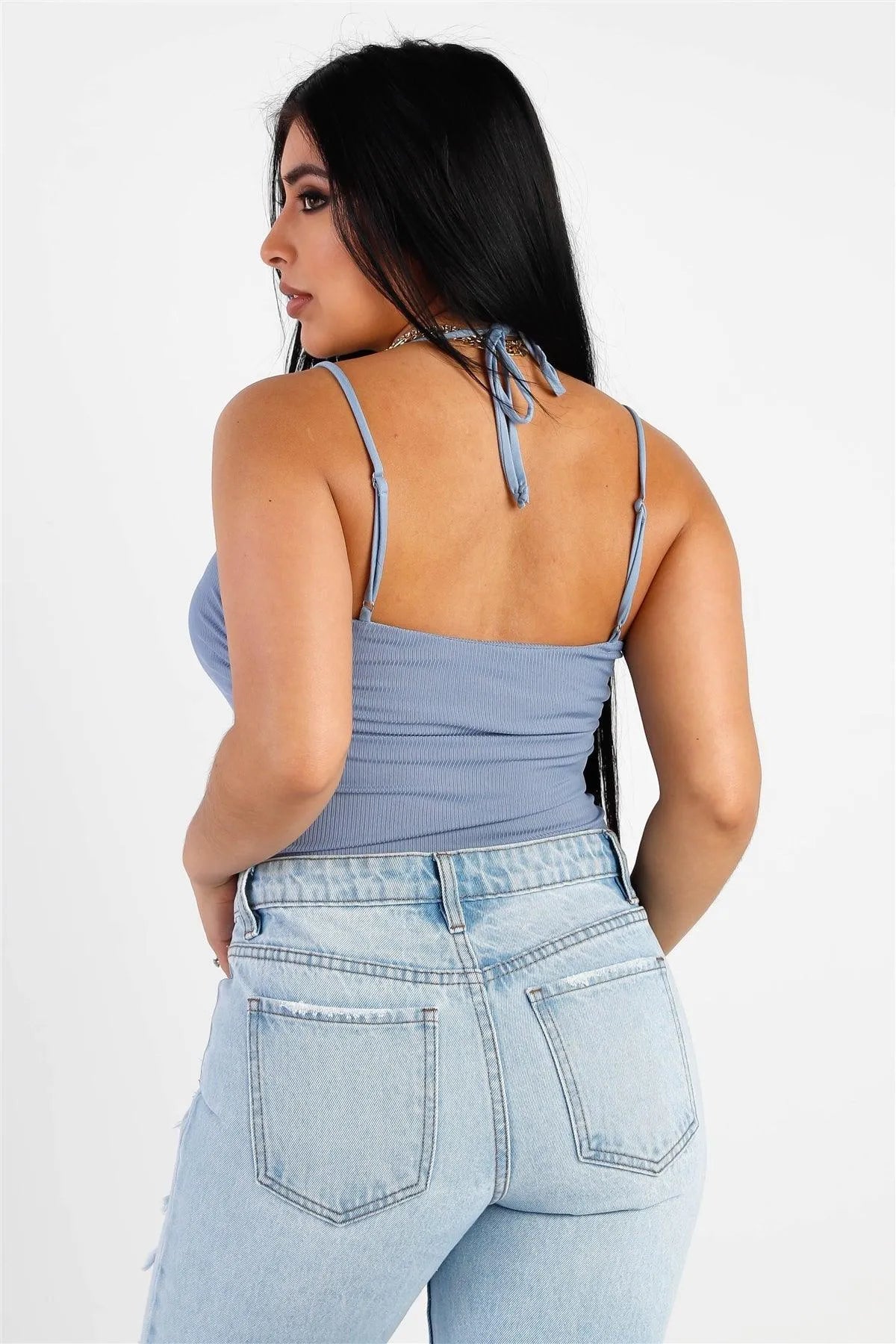 Dusty Blue Ribbed Self-Tie Neck Detail Sleeveless Bodysuit /2-1