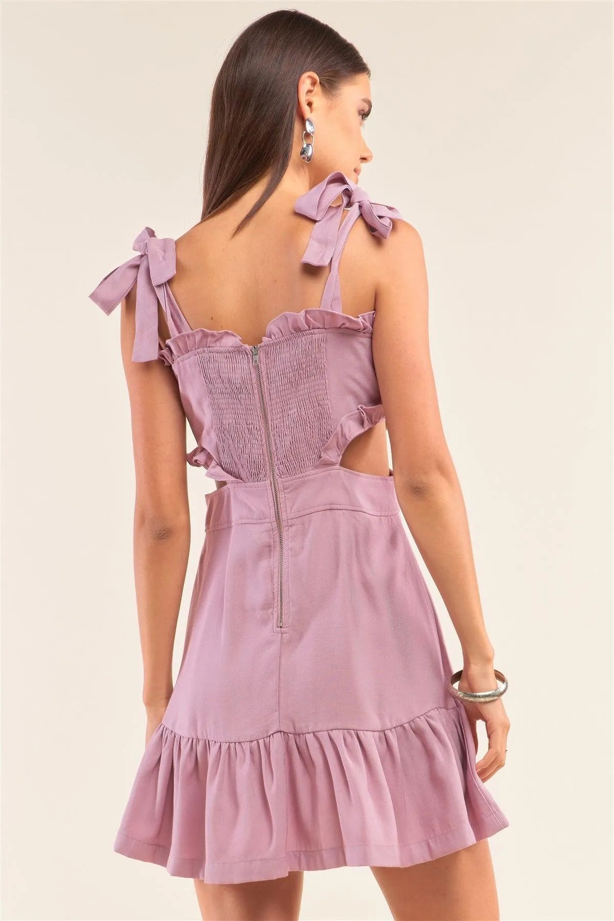 Dusty Lavender Sleeveless Ruffle Hem Cut-Out Detail Smock Back Flare Mini Dress /1-3-2