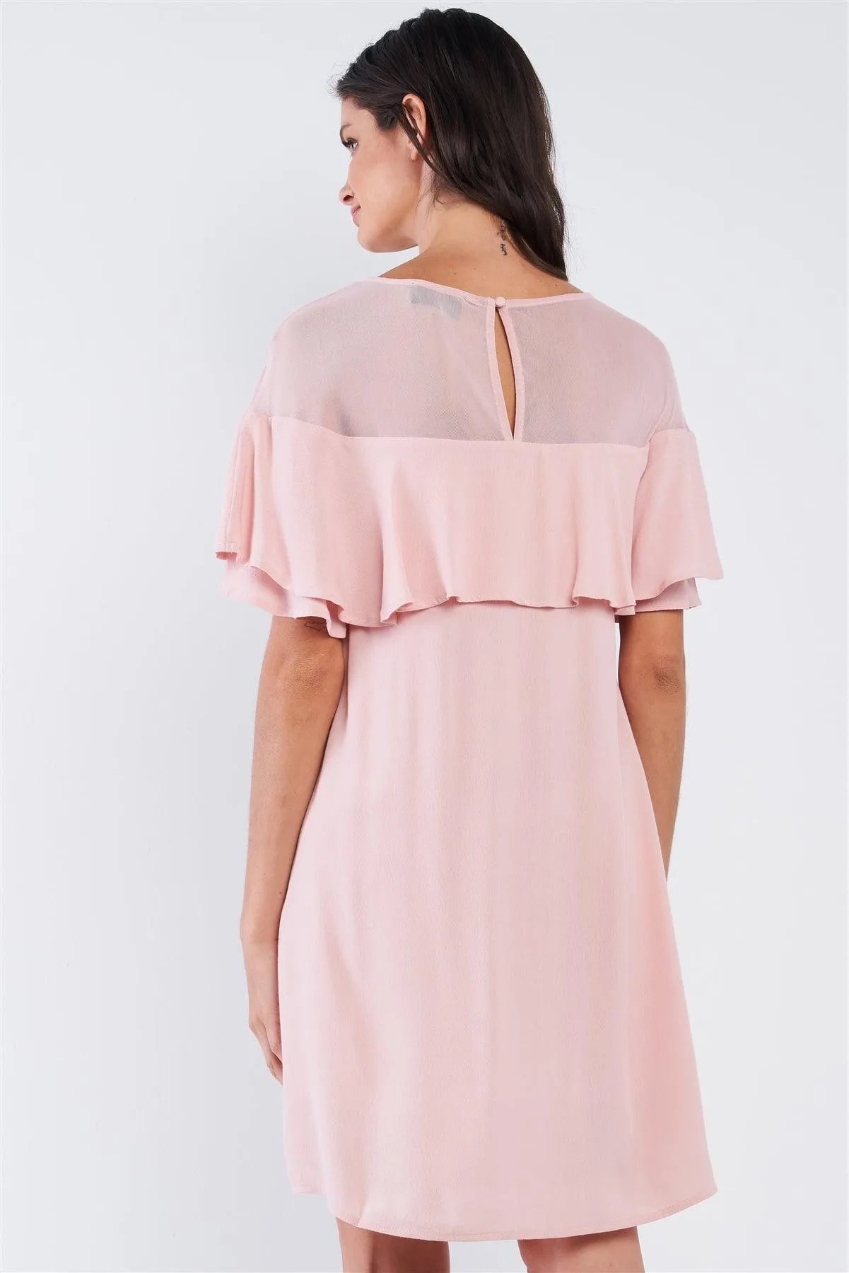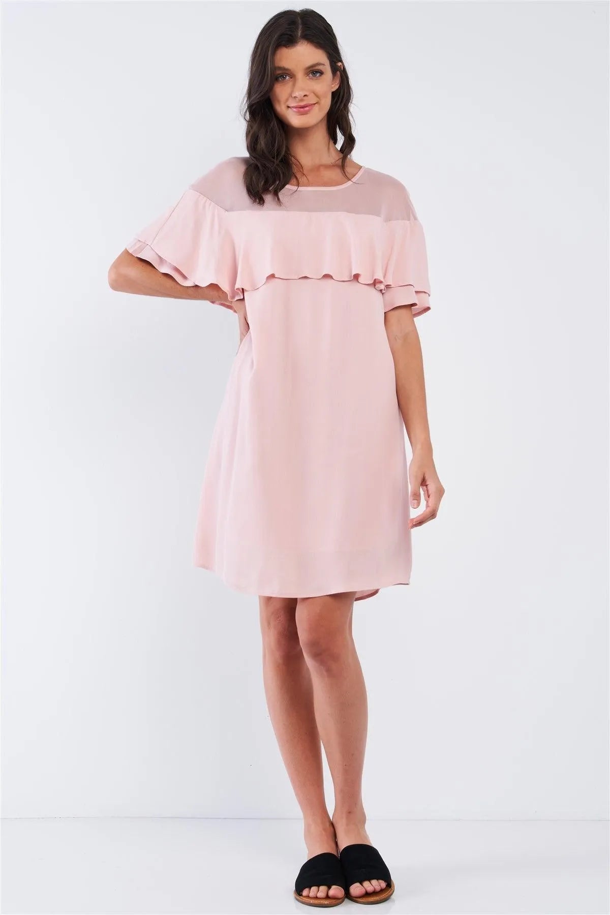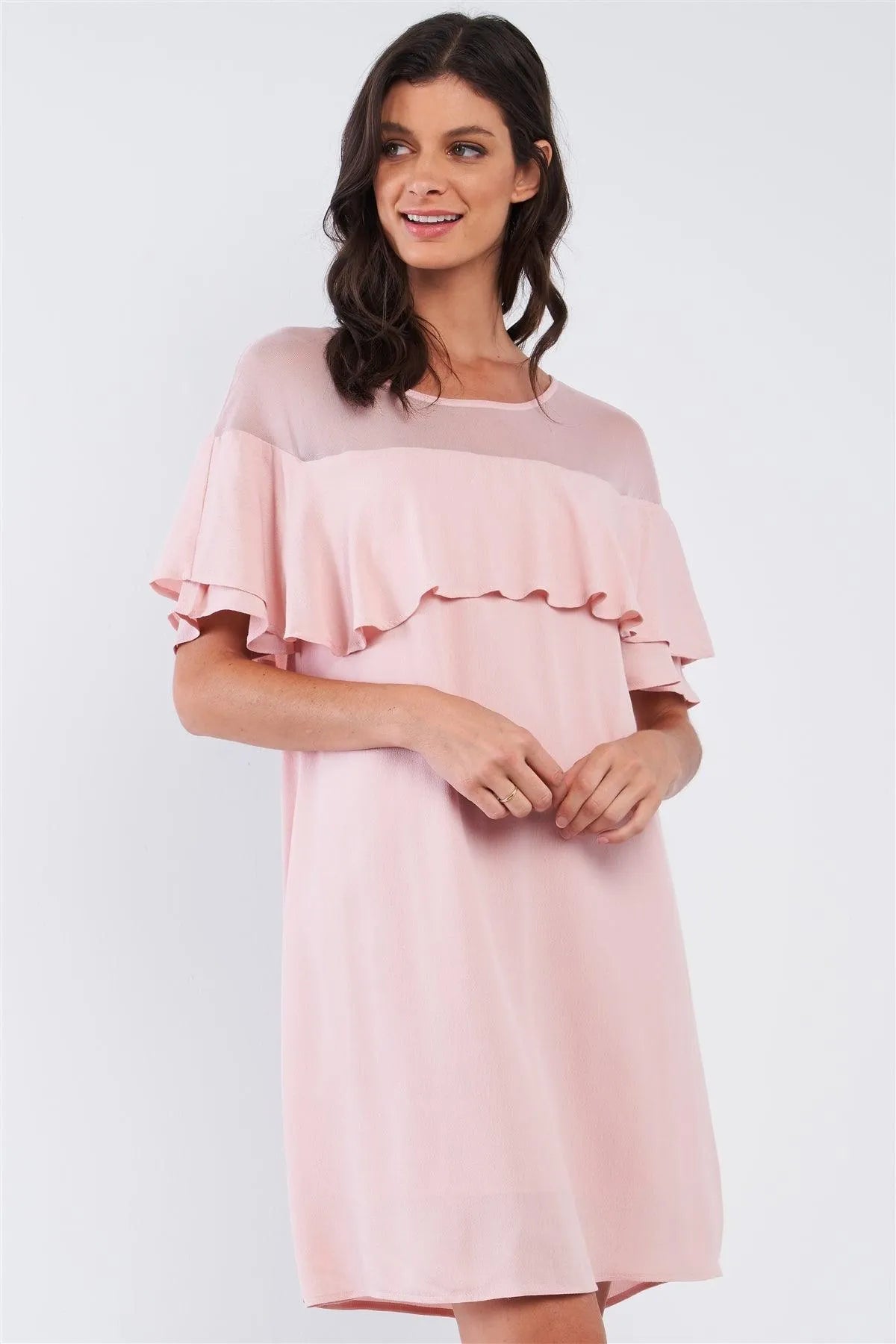 Dusty Pink Loose Fit Chest Lace Mesh Detail Ruffle Off-The-Shoulder Hem Mini Dress