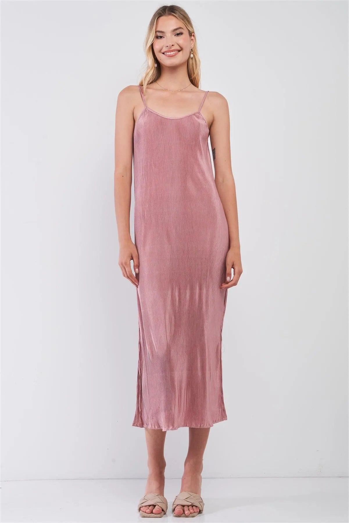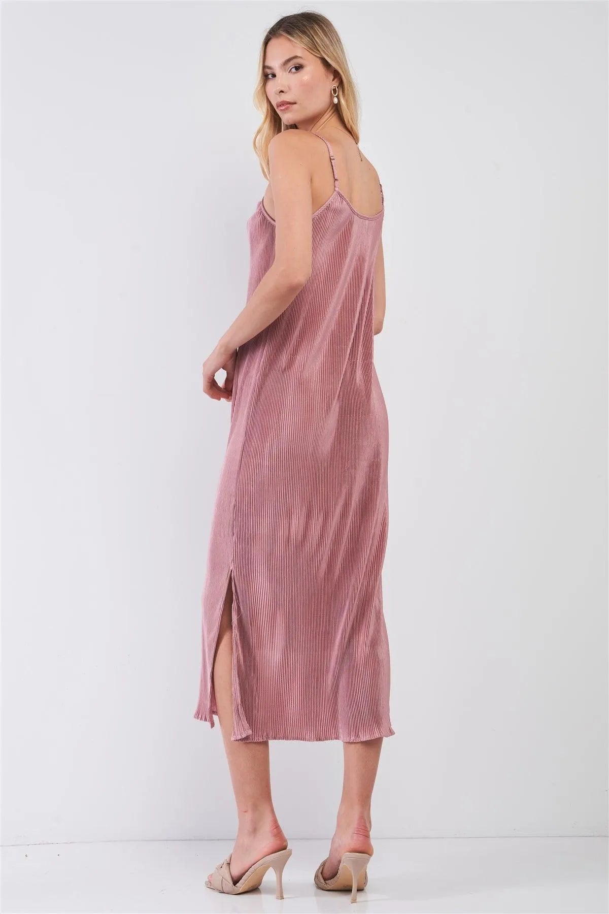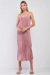 🖤 Item Features: Dusty pink, shiny finish, solid, pleated, sleeveless, adjustable shoulder straps, round neckline, sides slit detail, midi length, relaxed fit, unlined, not see through, slight stretch, casual, boho, girly, cute, date look, light, comfy, spring/summer collection