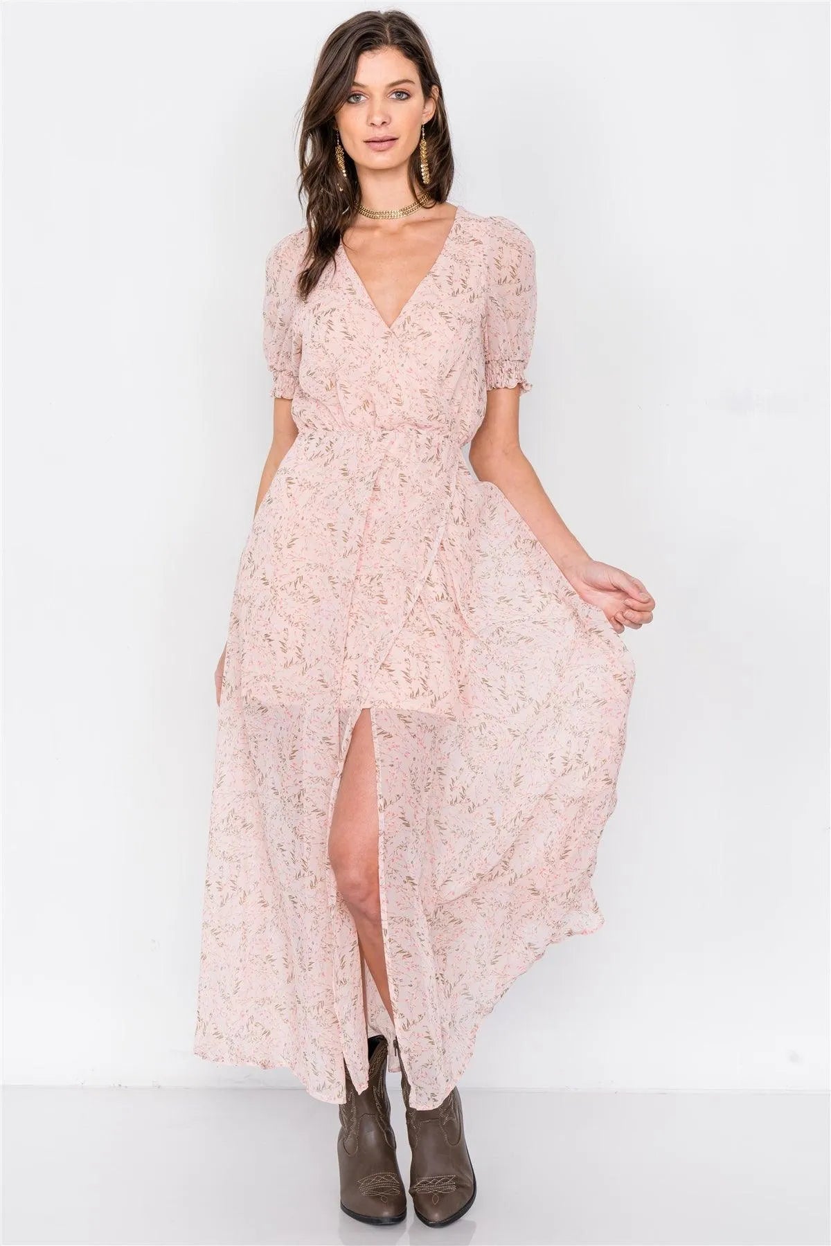 Dress Features: v-neck, open back, waist and top back self tie, full maxi side slit, green pink and white watercolor floral print, boho, chic, country, elastic cinched waistband, cinched puff cap sleeve, partially lined, stretchy.Item Measurements: Length: 53" , Bust: 26" , Sleeve: 12"Model is 5'9 wearing a size Small ( Waist: 23.5", Bust: 32B, Hips: 36")Item comes pre-packed with hang tagsTrue to Size