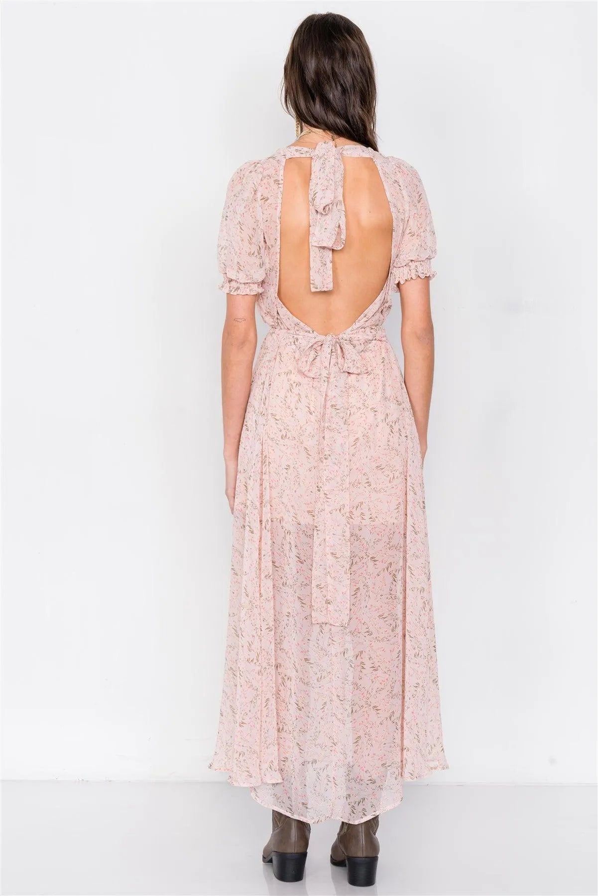 Dusty Rose Pink V-Neck Open Back Sheer Chiffon Maxi Dress /3-2-1