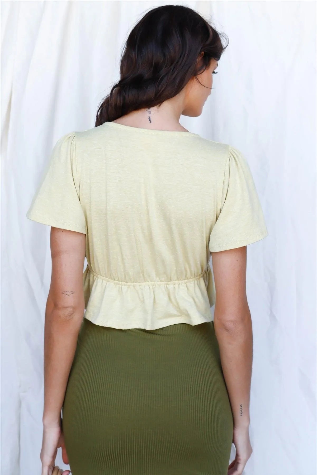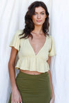 🖤 Item Features: Dusty yellow, solid color, short sleeves, v-neckline, elasticized waistband with ruffle, cropped length, non-sheer, stretchy, unlined, casual, trendy, stylish, cute, girlish, summer vibe