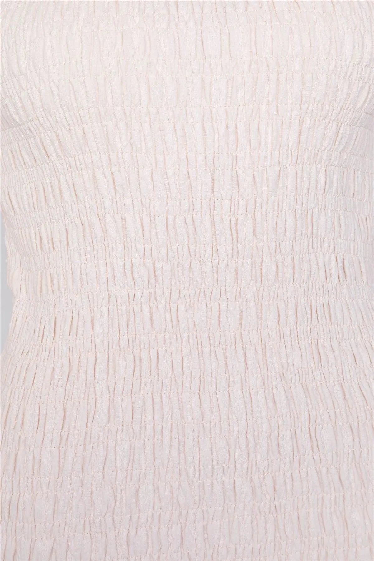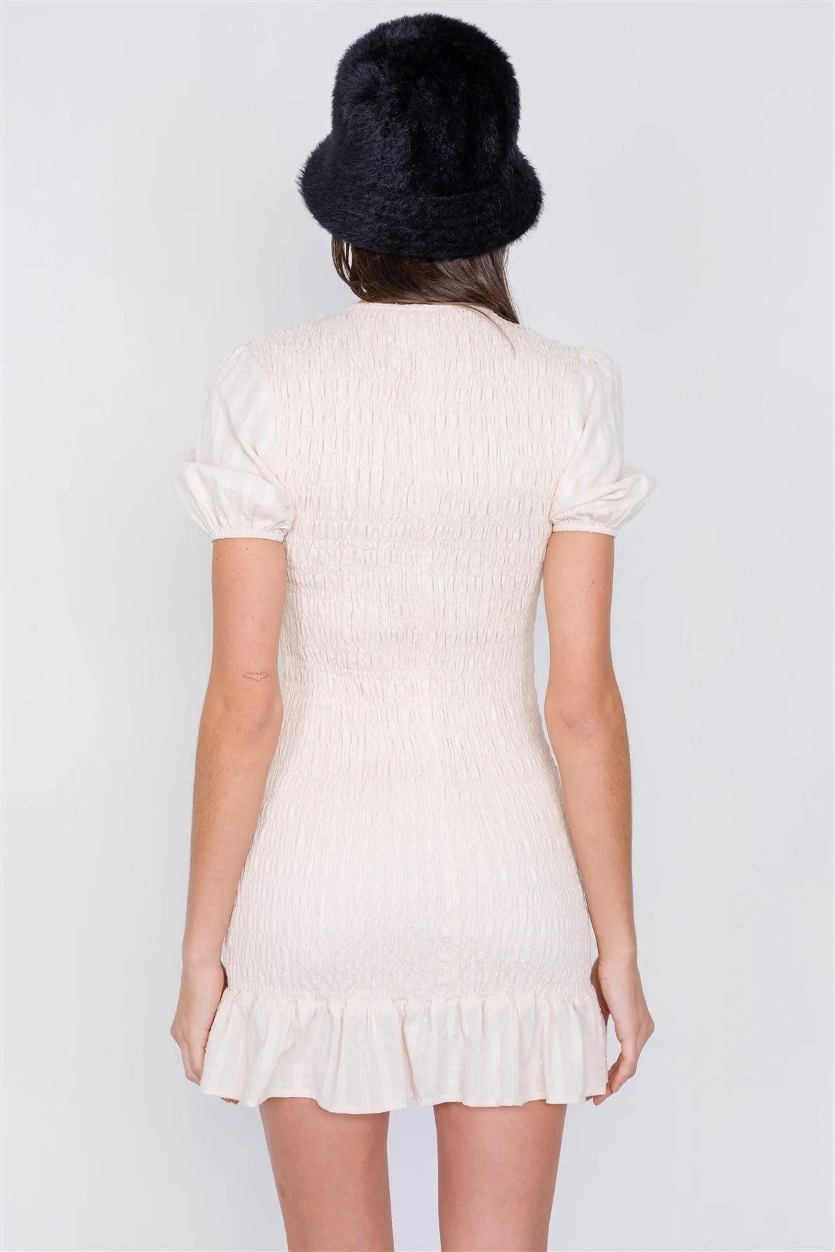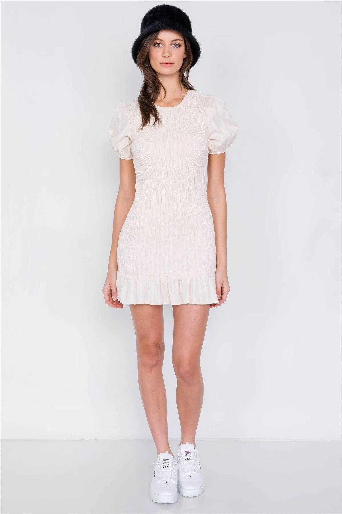 Ecru Smocked Frill Mermaid Hem Puff Sleeve Mini Dress /2-2-1