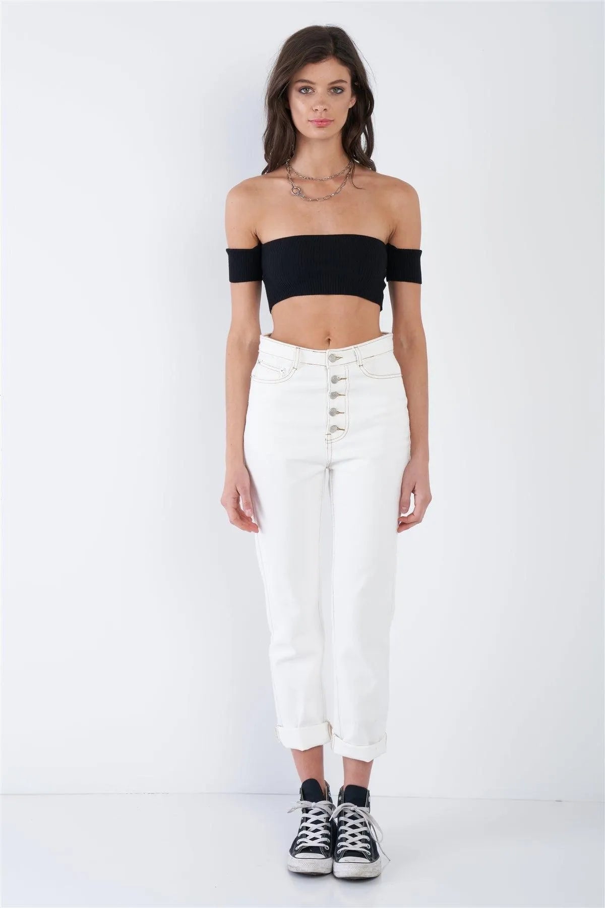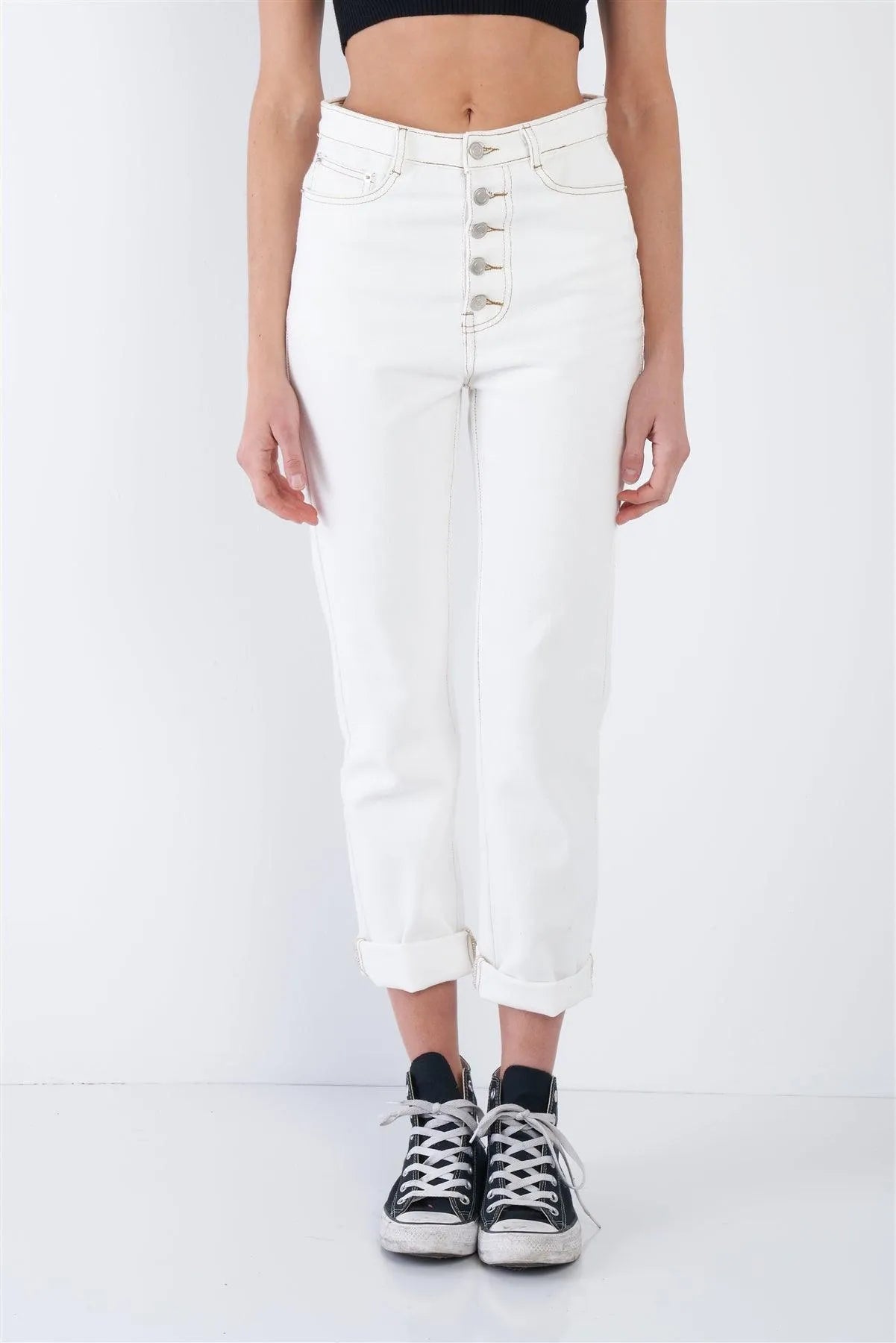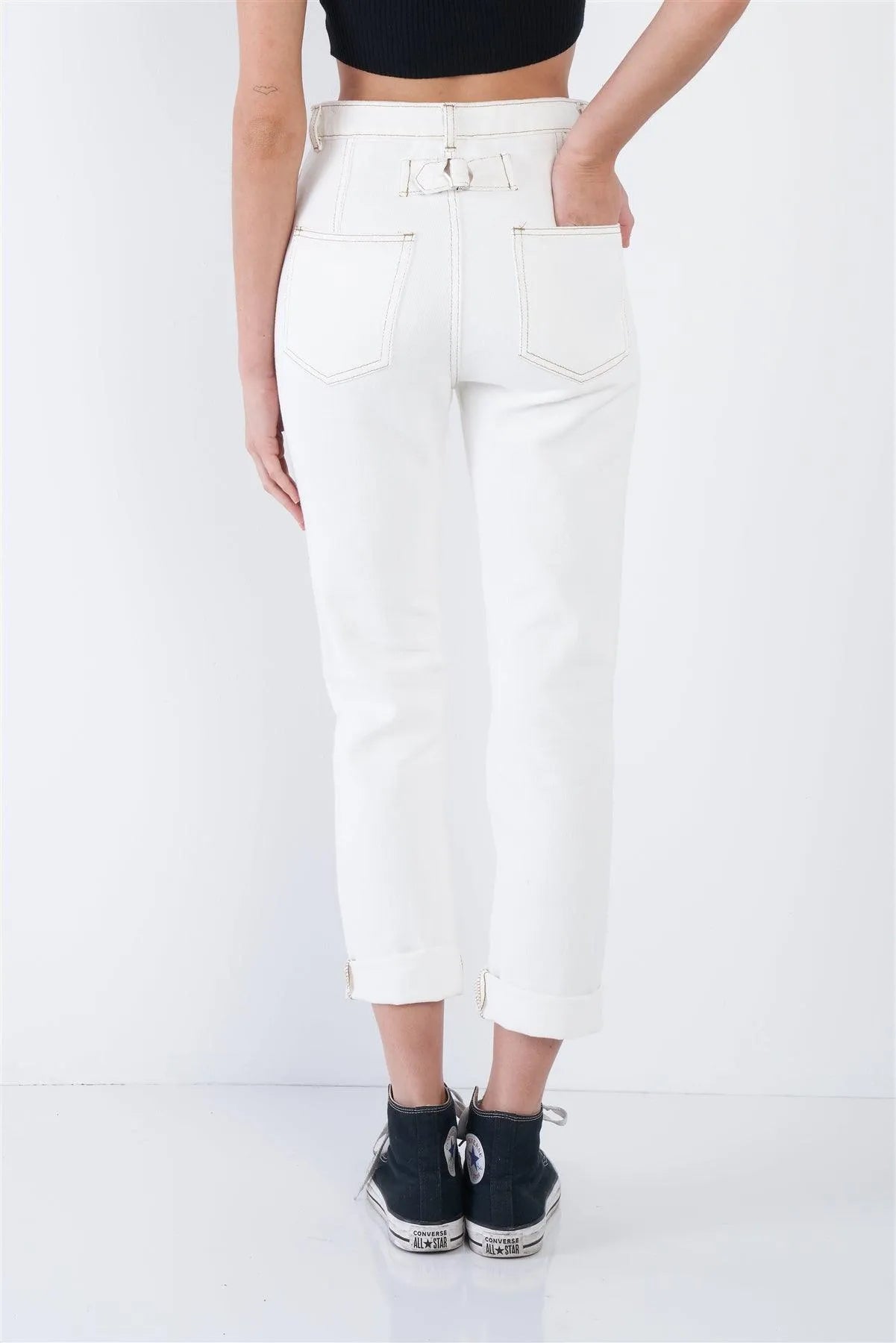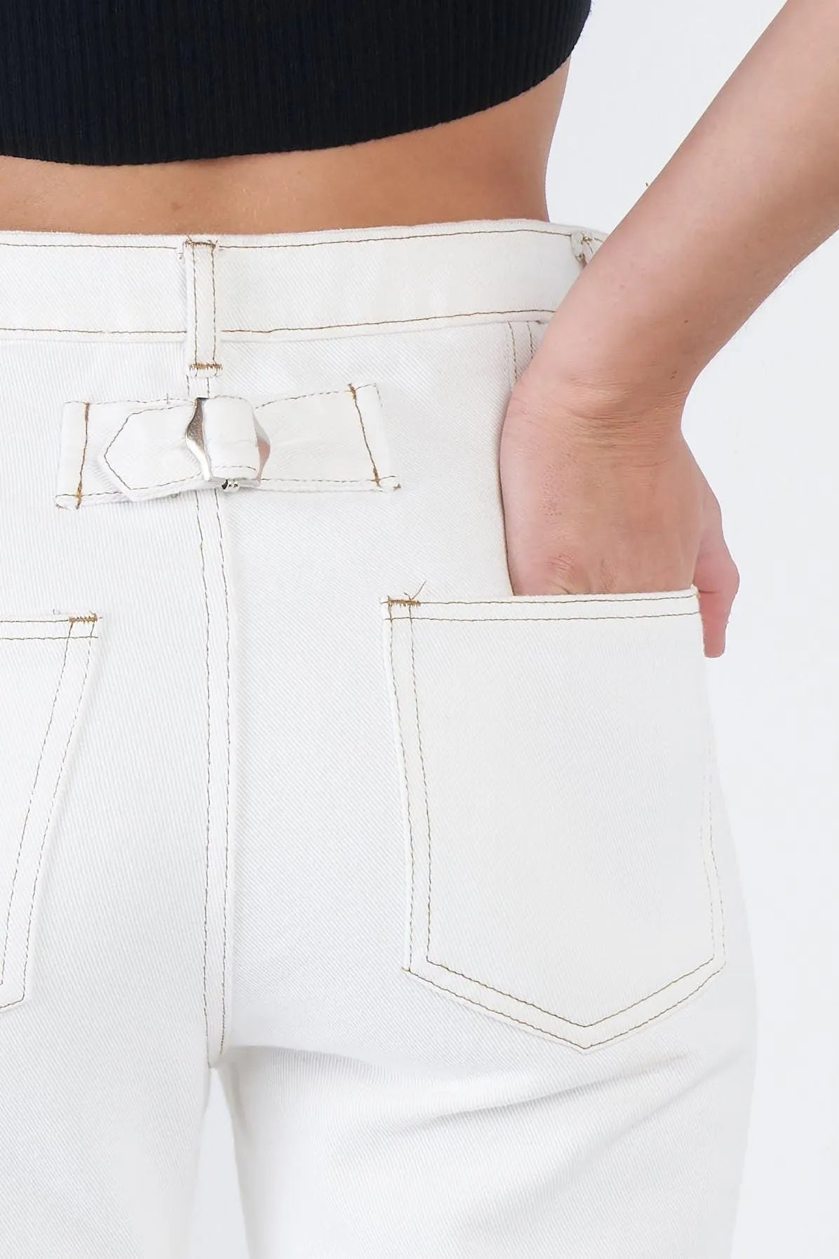 Pant Features: denim, white, ecru, off-white, brown stitch details, casual, belt loop, chic, solid, cotton, casual, relaxed fit, unlined, super stretchy.Model is 5'9 wearing a size Small ( Waist: 23.5", Bust: 32B, Hips: 36")Item Measurements: Length: 39.5" , Waist: 28"Item comes pre-packed with hang tagsTrue to size