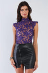Eggplant Purple Mesh Floral Embroidered Turtle Neck Short Flutter Sleeve Bodysuit