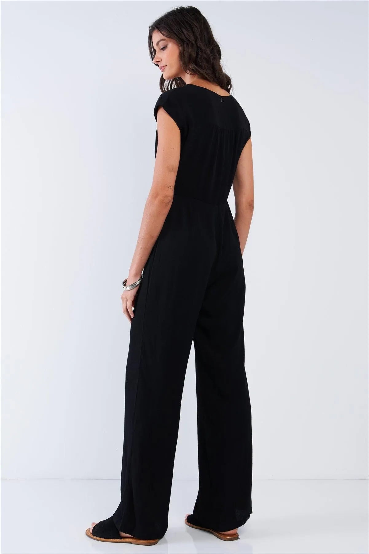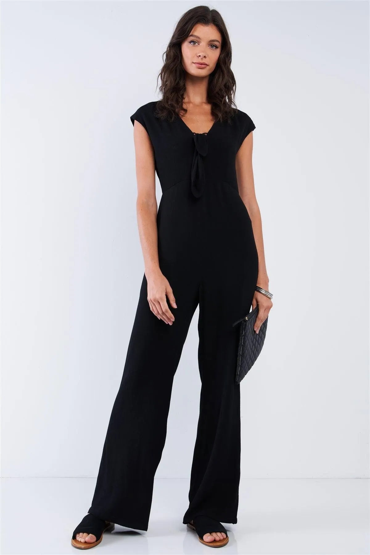 🖤 Item features: Black, solid, chiffon like touch, sleeveless, wide leg, zipper back, lined breast, v-neck, bow tie detail, non-stretch, classy, casual, elegant