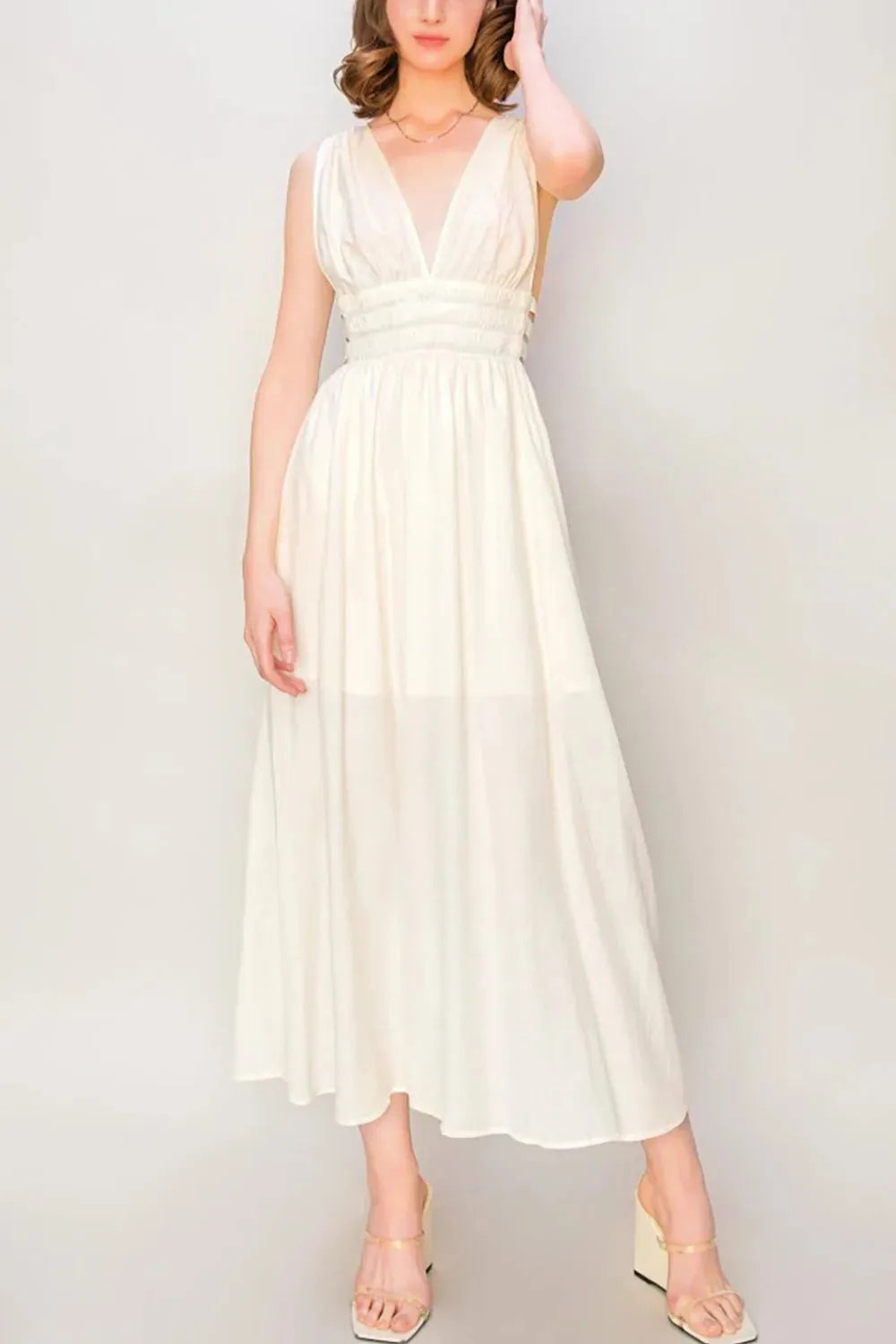 Elegant Side Cut Smocked Waist V-Neck Sleeveless Maxi Dress