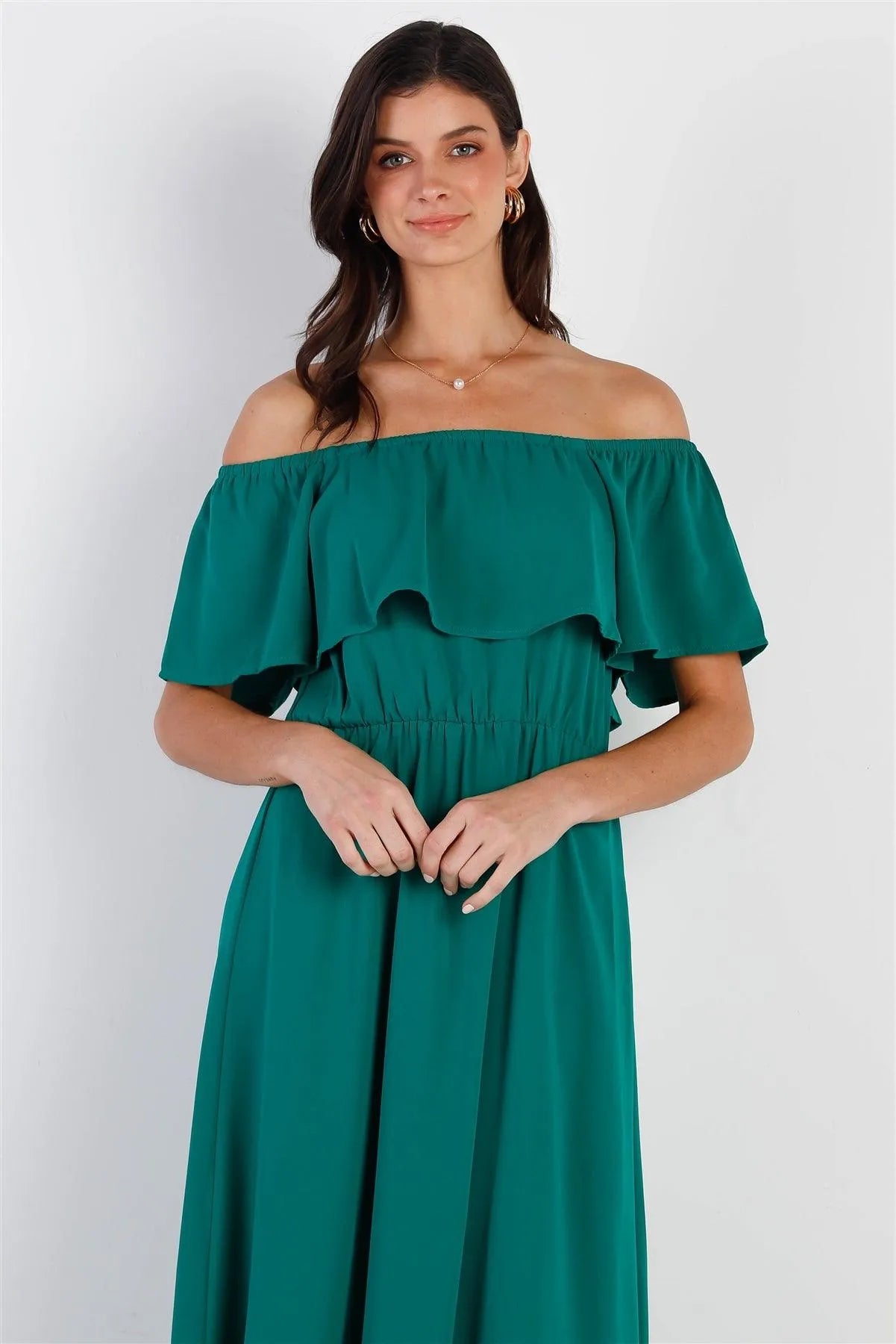 🖤 Item Features: Emerald, solid color, off-the-shoulder style, ruffle elasticized collar, short sleeves, elasticized waistline, maxi length, relaxed fit, non-sheer, non-stretchy, elegant, chic, girlish, trendy