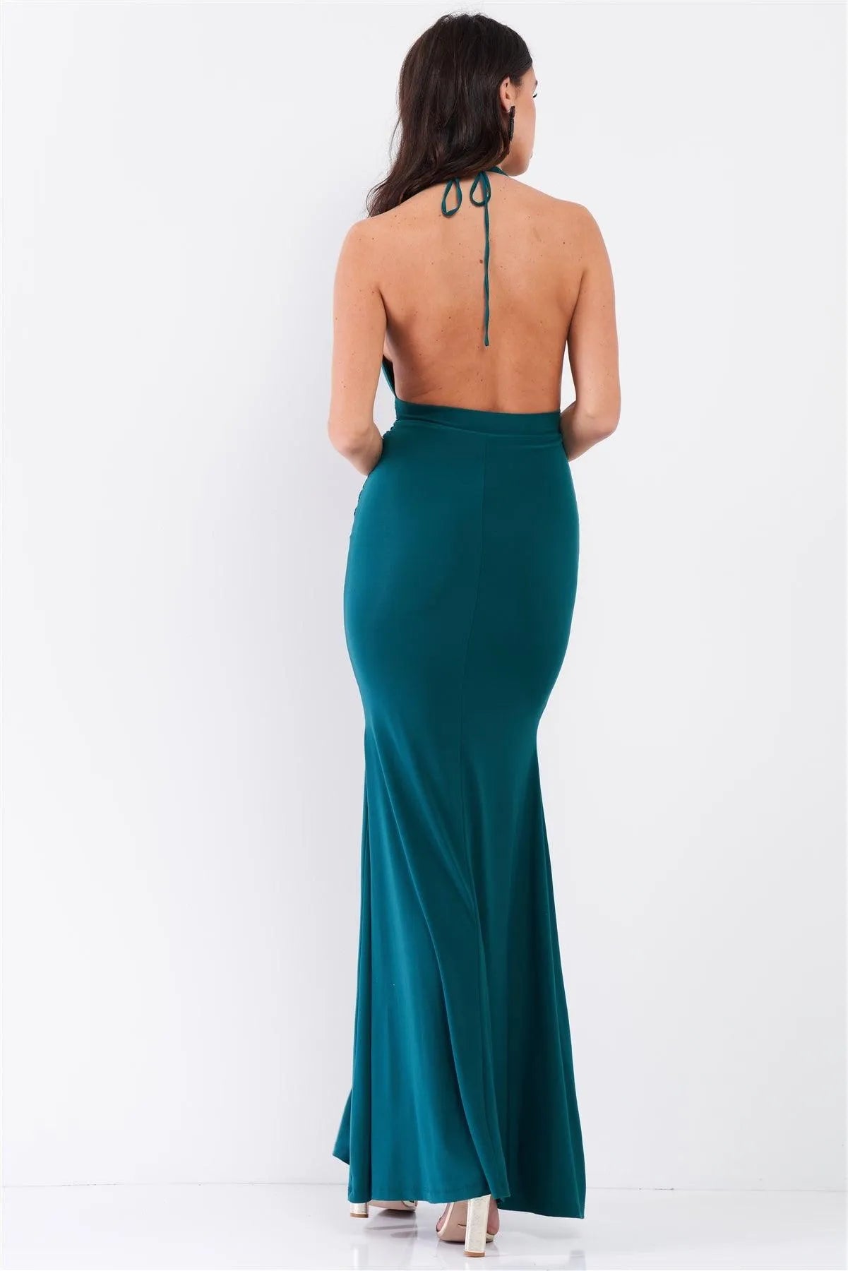 Emerald Halter Neck Front Cut Out Detail Ruched Self-Tie Long Straps Open Back Mermaid Maxi Dress /3-1-2