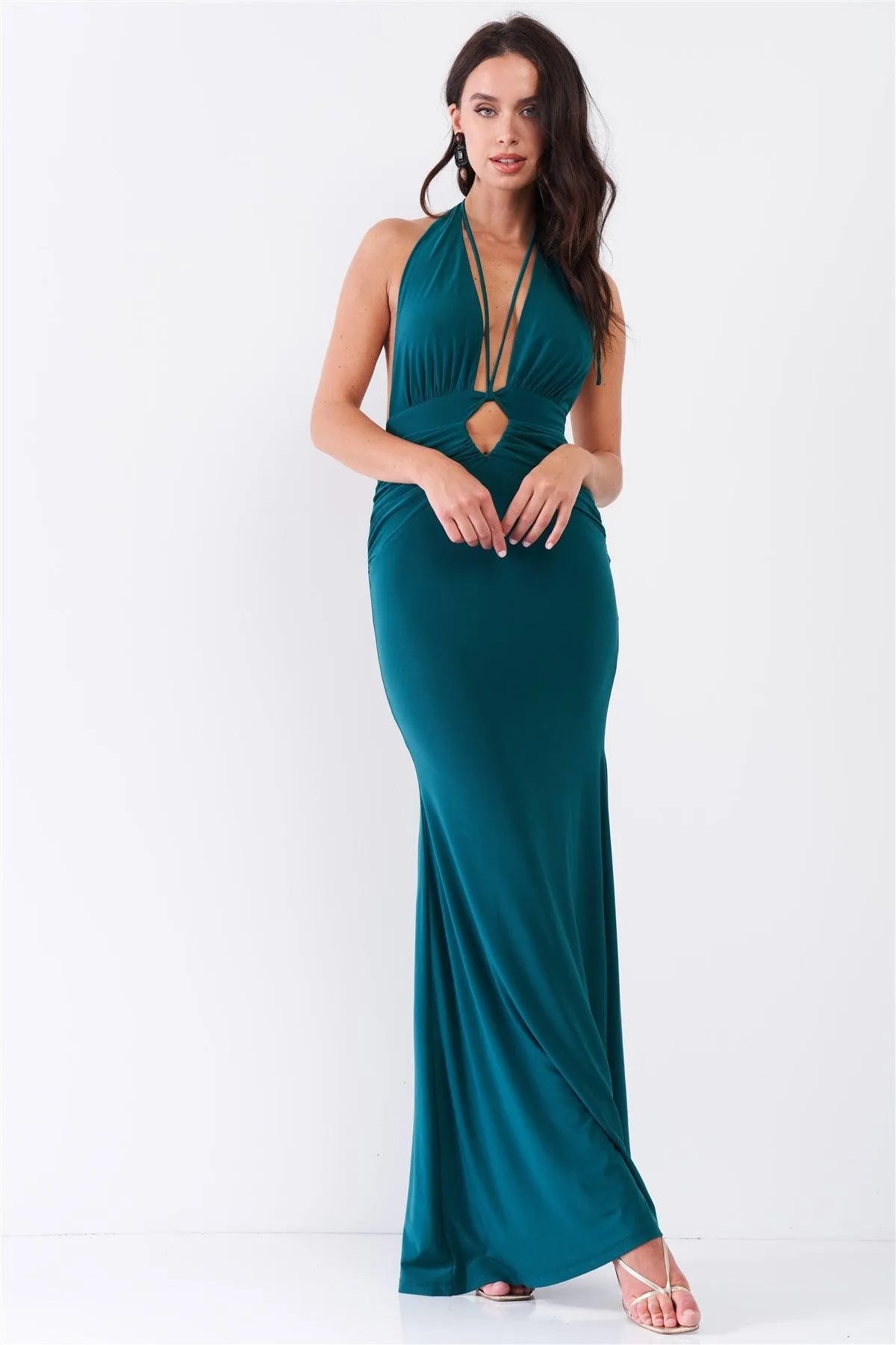 🖤 Item Features: Solid emerald, sleeveless, front cut out detail, halter neck, ruched, nape self-tie strap, open back, mermaid cut, maxi length, lined, stretchy, hot, sexy, club wear, night out, party look, fall/winter chic collection