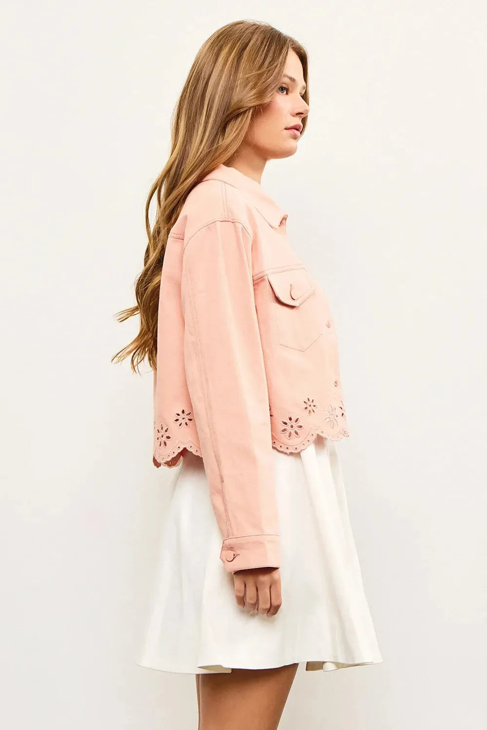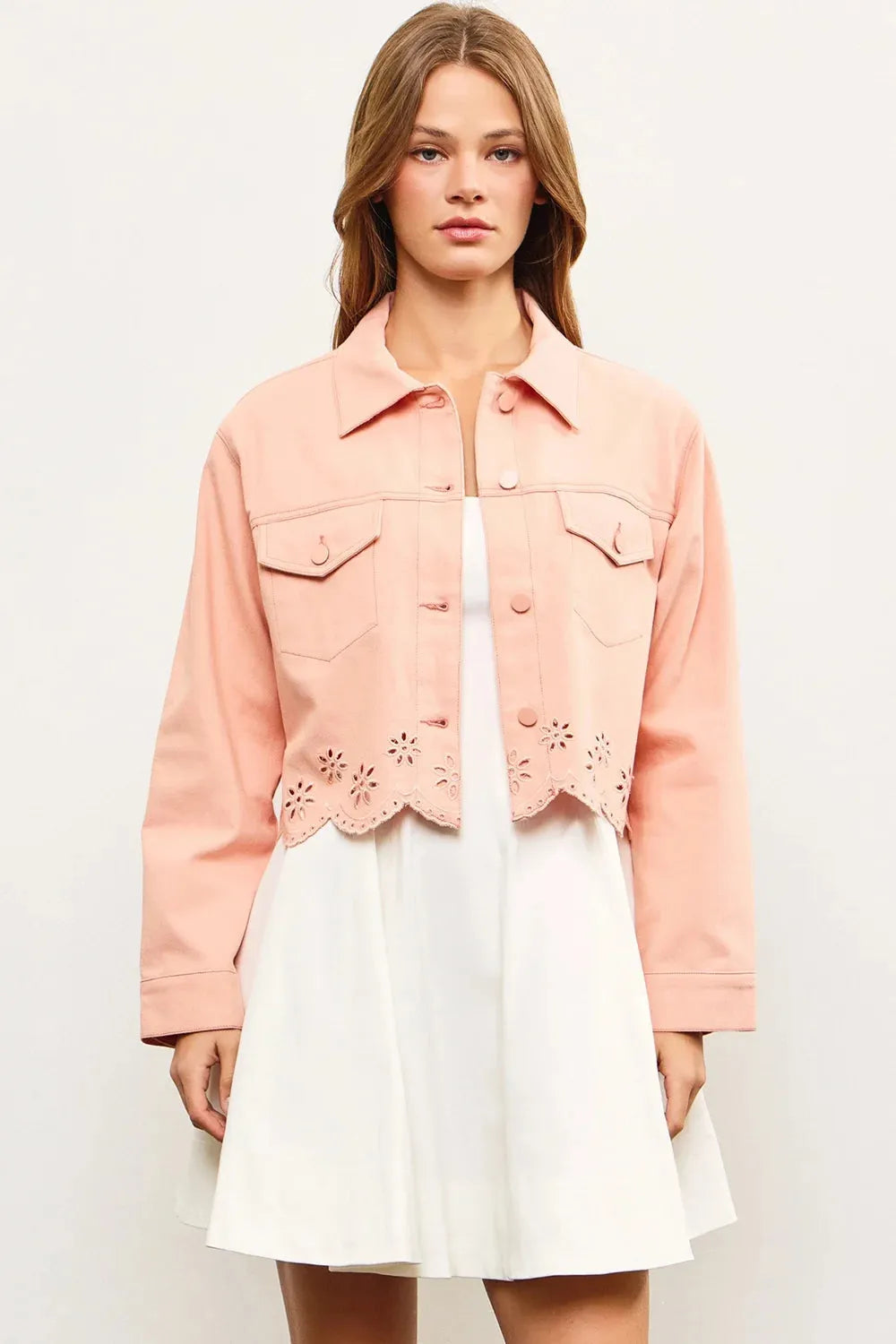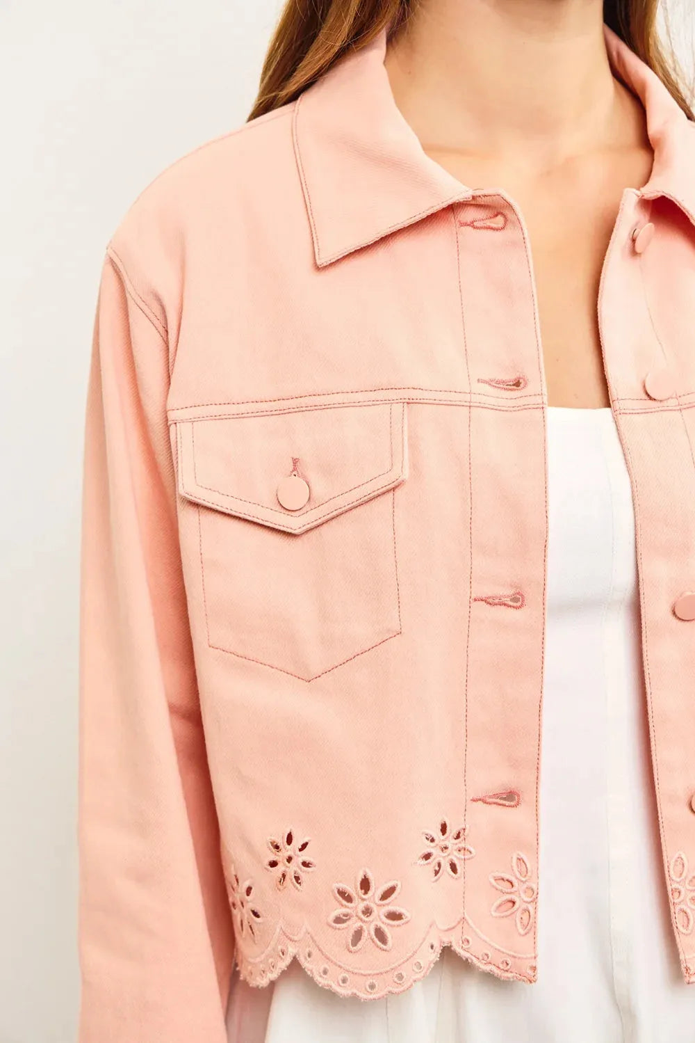 Women jacket: embroidered details, button down closure, chest pockets with button closure, button banded cuffs, scalloped hemline, collared. Whether you want to go for a boho or western vibe, it transitions easily! The embroidered detailing adds the perfect touch of timeless style.