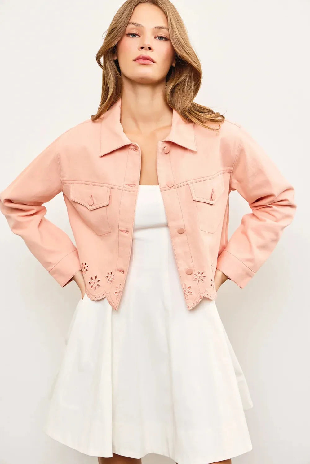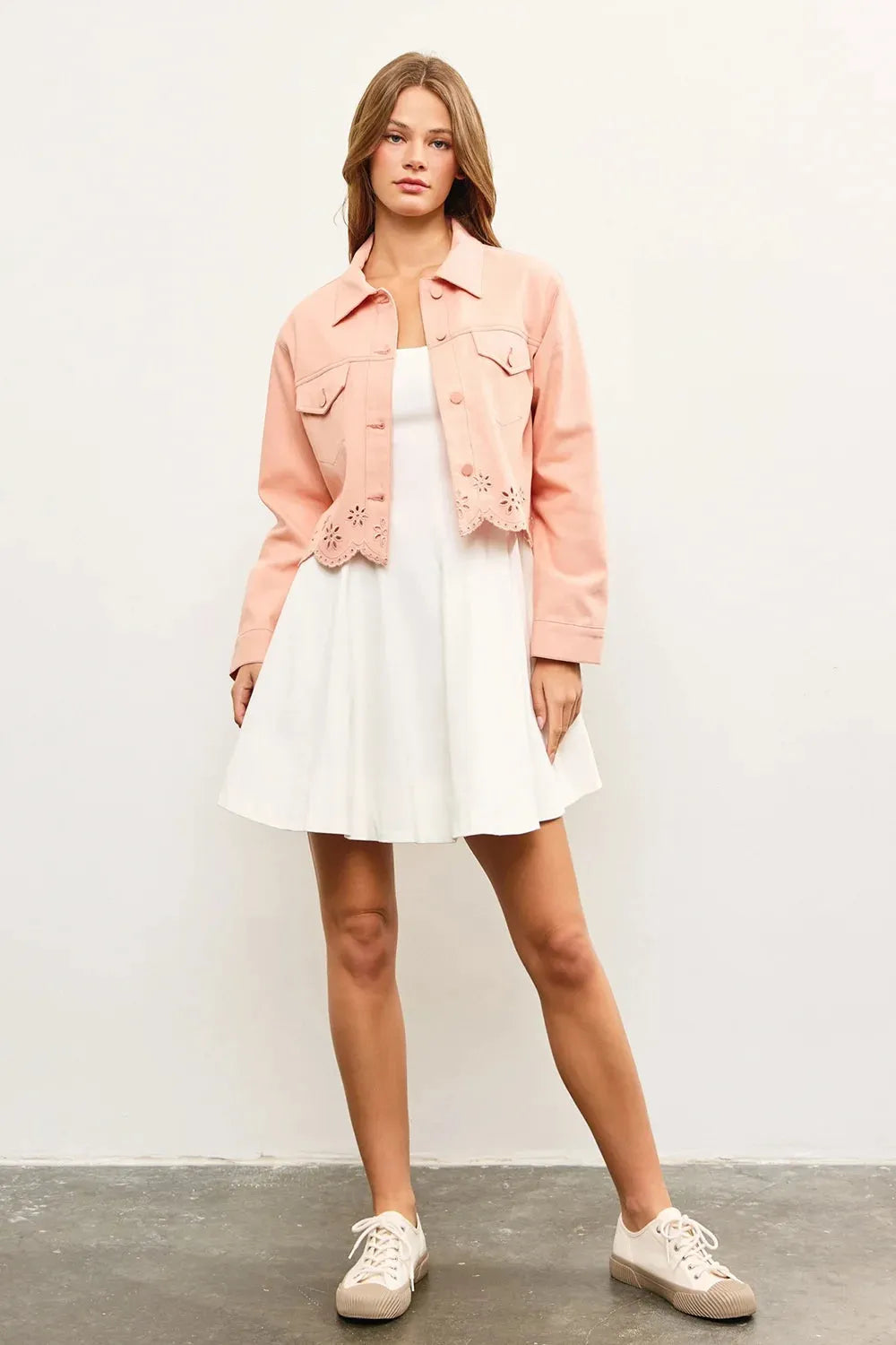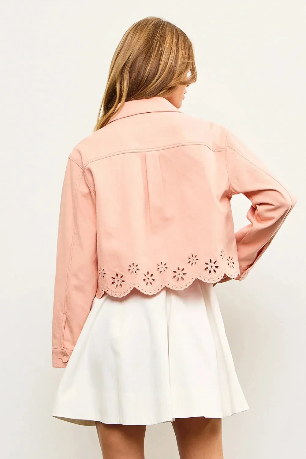 Women jacket: embroidered details, button down closure, chest pockets with button closure, button banded cuffs, scalloped hemline, collared. Whether you want to go for a boho or western vibe, it transitions easily! The embroidered detailing adds the perfect touch of timeless style.
