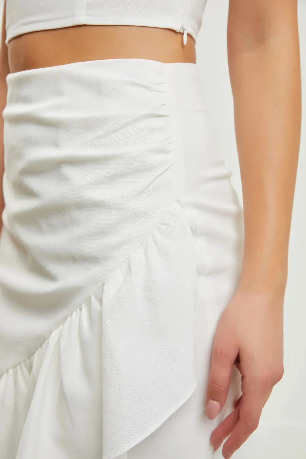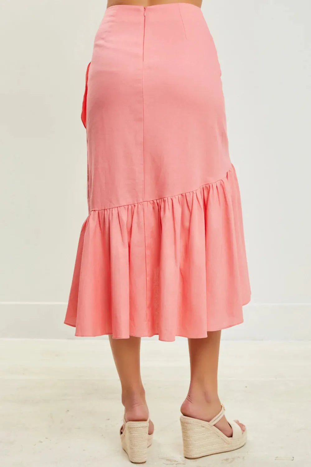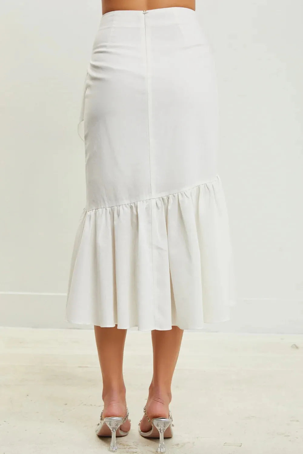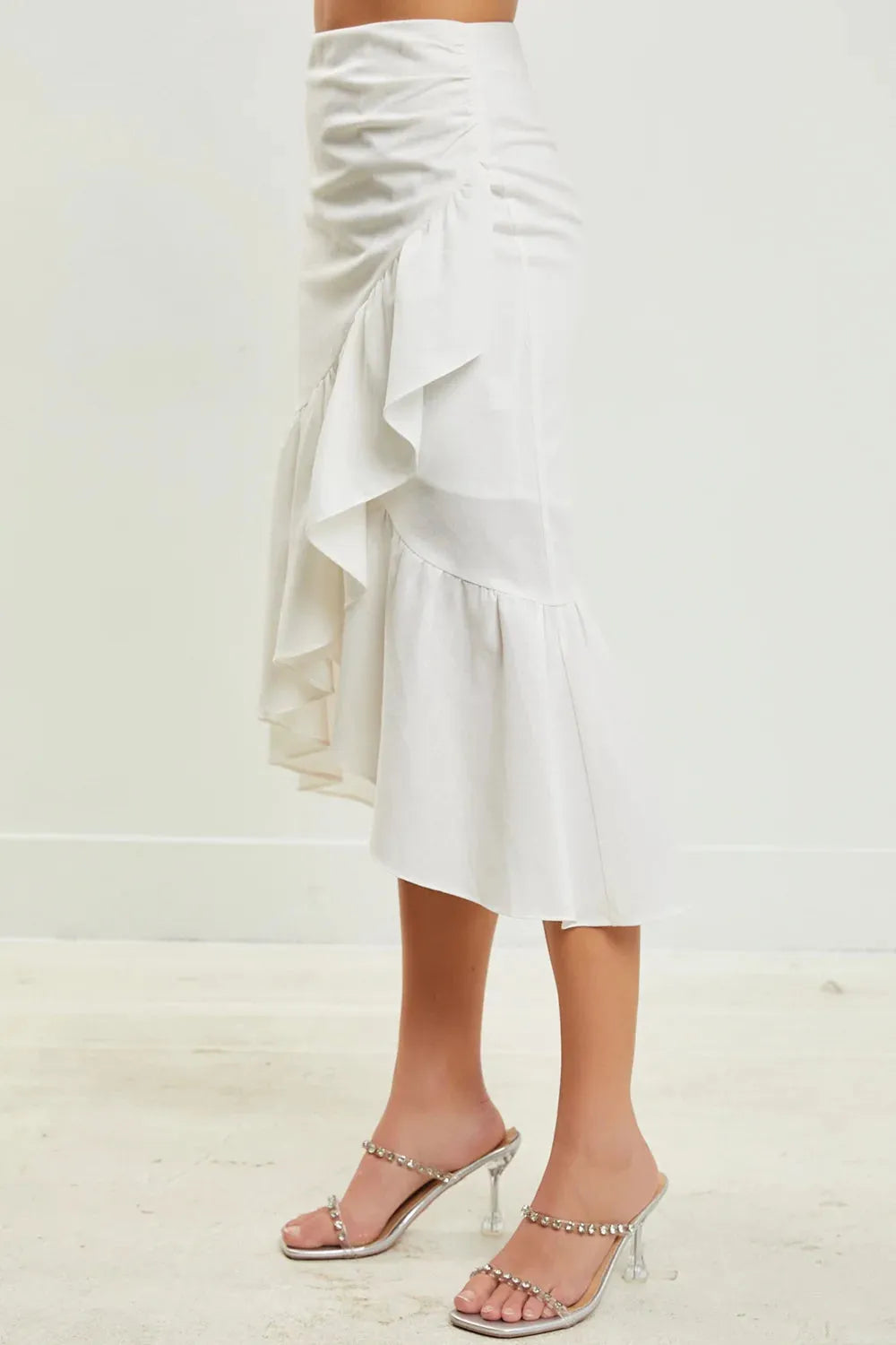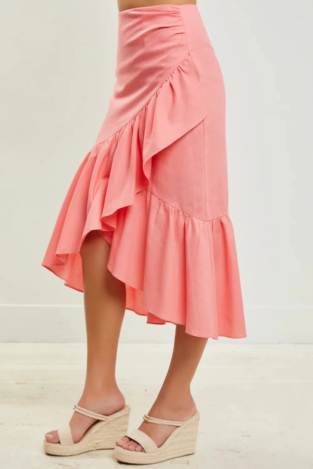 The Ruffle Asymmetric Wrap Midi Skirt combines elegance and contemporary design, featuring a flattering wrap silhouette that enhances the figure. Its asymmetric hemline adds a touch of modernity, while delicate ruffles create a sense of movement and femininity. Crafted from high-quality materials, this skirt is perfect for both casual outings and formal occasions, offering versatility and style in one chic piece.