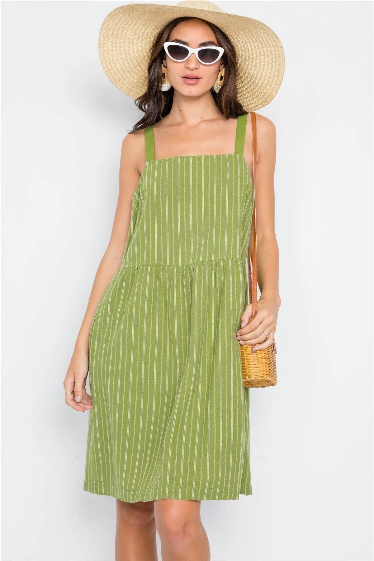 Green Sleeveless White Stripe Button Back Hemp Fern Dress / 1-3-1-1