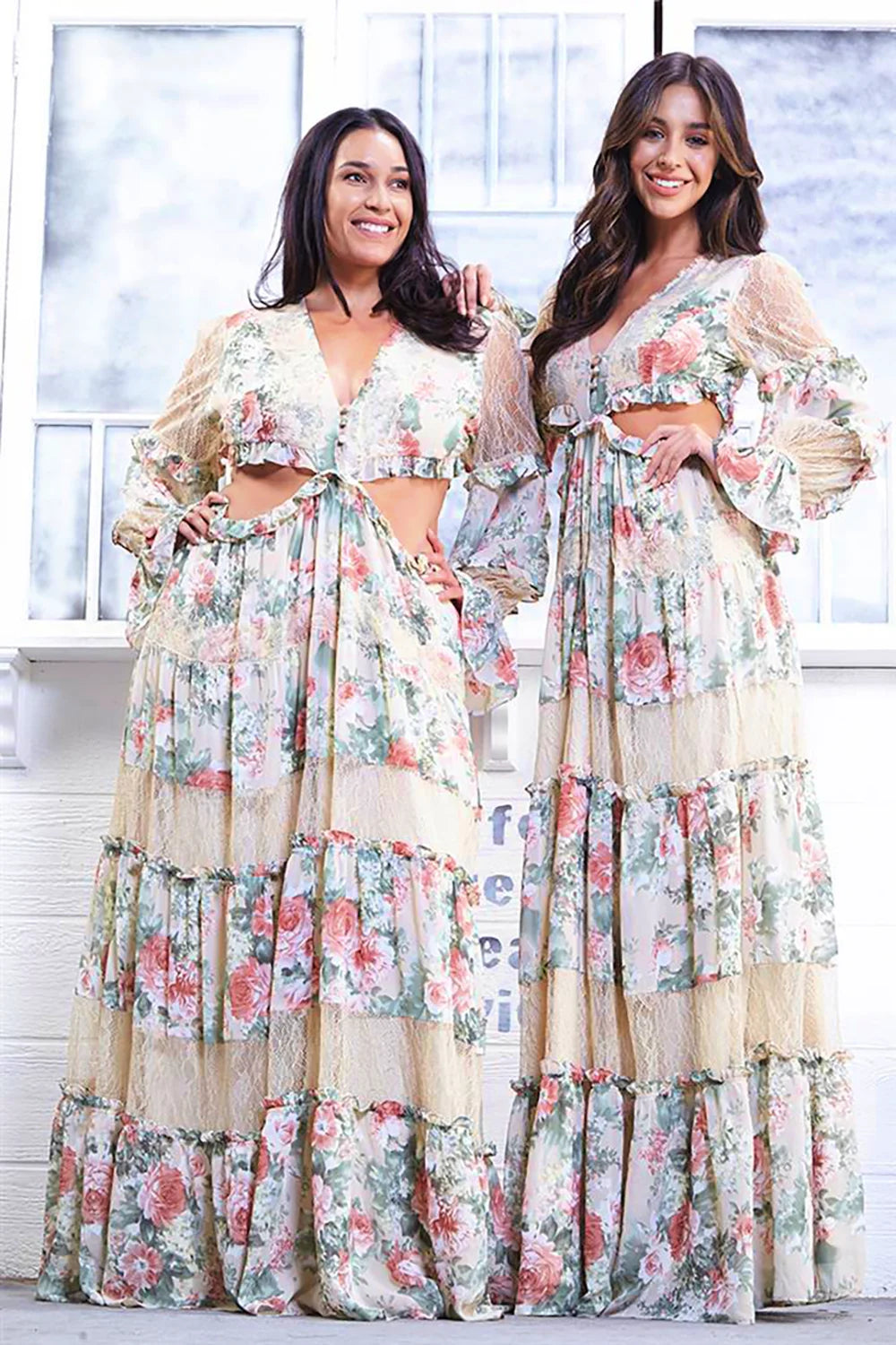 🖤 Features: Floral pattern, cut out, flowy maxi length, ruffle detail along the skirt, semi-sheer bottom layer, lace detail, front button, open back, v-neck, not see through, tiered, back zipper closure.