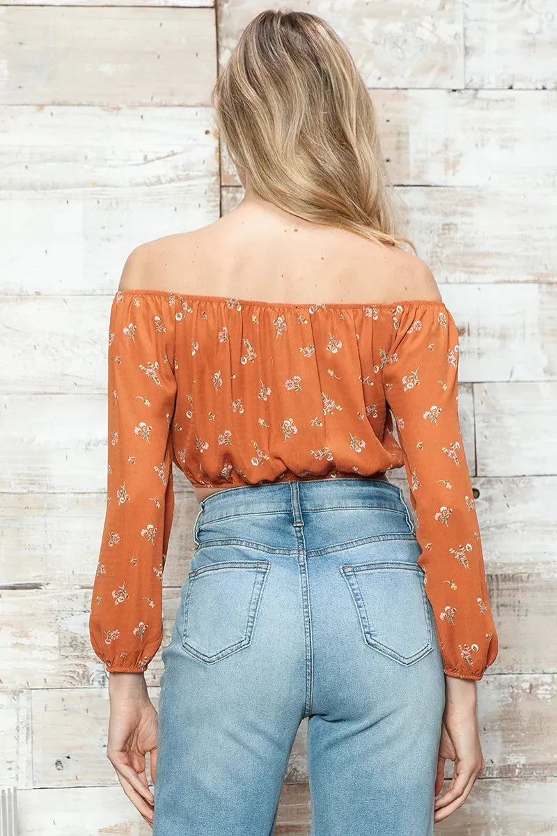 🖤 Features: Lightweight fabric, adjustable front drawstring, off-shoulder design, elastic neckline, long sleeves with elastic cuffs, cropped length, delicate floral print, available in black and orange