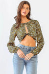 🖤 Features: Long balloon sleeves, crop length, twist-front detail, keyhole cutout, all-over floral print, lightweight fabric, versatile styling options